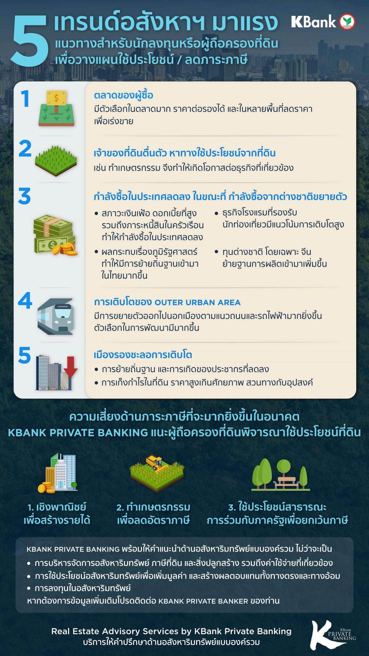 ได้กว้างมากขึ้น นอกจากนี้ ภาระภาษียังเป็นเรื่องสำคัญที่ผู้ถือครองที่ดินต้องตระหนักถึง เนื่องจากภาษีที่ดินที่มีแนวโน้มเพิ่มสูงขึ้นเรื่อยๆ ทั้งจากฐานภาษีและอัตราภาษีที่เพิ่มสูงขึ้น ดังนั้นแทนที่จะปล่อยให้รกร้างว่างเปล่าเพราะในกรณีที่ที่ดินรกร้างว่างเปล่า ในทุก 3 ปี ผู้ถือครองที่ดินจะถูกเก็บภาษีเพิ่มอีก 0.3% KBank Private Banking แนะนำให้ผู้ถือครองที่ดินพิจารณาใช้ประโยชน์ที่ดิน