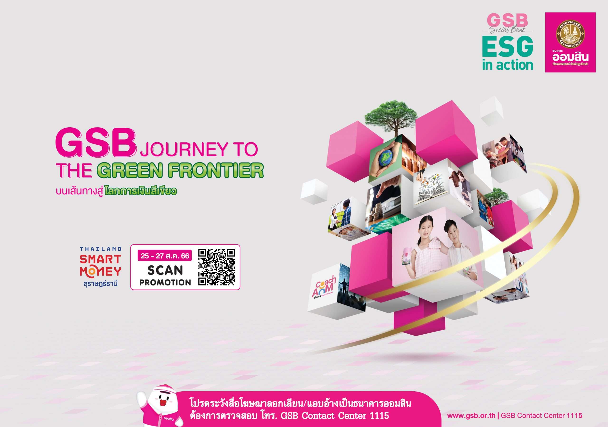 ธนาคารออมสิน เข้าร่วมงาน Thailand Smart Money สุราษฎร์ธานี ครั้งที่ 9 ระหว่างวันที่ 25-27 ส.ค. 2566 ณ เซ็นทรัล สุราษฎร์ธานี ภายใต้แนวคิด “GSB Journey to The Green Frontier : บนเส้นทางสู่โลกการเงินสีเขียว” สอดคล้องตามยุทธศาสตร์ธนาคารเพื่อสังคมที่มุ่งเน้นดำเนินการตามกรอบ ESG in action สู่การพัฒนาที่ยั่งยืน โดยให้ความสำคัญตั้งแต่กระบวนการจัดทำบูธที่เลือกใช้วัสดุที่เป็นมิตรต่อสิ่งแวดล้อม พร้อมนำเสนอโปรโมชันน่าสนใจในงานนี้ ทั้งผลิตภัณฑ์เงินฝากส่งเสริมการออมสำหรับทุกวัย สินเชื่อบุคคล เงินกู้บ้าน ที่เข้ากับกระแสรักษ์โลก แหล่งเงินทุน/เติมสภาพคล่อง สนับสนุนกิจการทุกกลุ่มลูกค้า