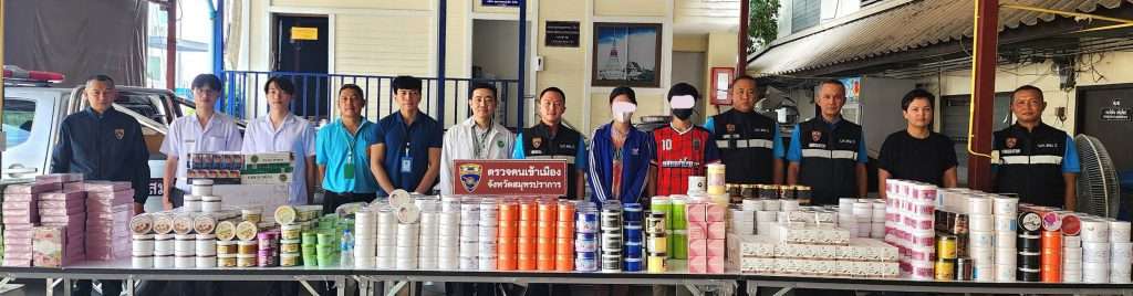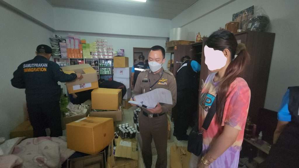 “ตม.สมุทรปราการ” แท๊กทีม-สาธารณสุข -จัดหางาน จ.สมุทรปราการ”บุกทลายแหล่งเก็บเครื่องสำอางเถื่อนรวบ 2 ผัวเมียชาวเขมร แอบขายผ่านสื่อออนไลน์