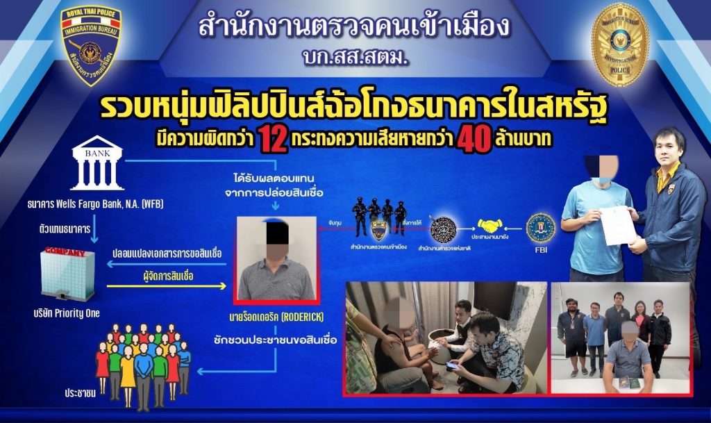 สตม. ได้รับการประสานงานจากสำนักงานตำรวจสืบสวนสอบสวนกลางสหรัฐอเมริกา หรือ FBI กรณีผู้ต้องหารายสำคัญ คือ นายร็อดเดอริค (RODERICK) นามสมมติ อายุ 54 ปี สัญชาติฟิลิปปินส์ ผู้ต้องหาตามหมายจับผู้ร้ายข้ามแดน ข้อหาสมรู้ร่วมคิดกันเพื่อฉ้อโกงธนาคารและการฉ้อโกงทางไปรษณีย์ กระทำความผิดกว่า 12 กระทง โทษจำคุกสูงสุด 30 ปี นายร็อดเดอริคเป็นพนักงานของบริษัท Priority One ทำหน้าที่ให้การสนับสนุนเงินทุนและขายสินเชื่อให้กับลูกค้า โดยนายร็อดเดอริคจะปล่อยสินเชื่อ เช่น สินเชื่อที่อยู่อาศัย และจัดทำข้อมูลเครดิตเท็จของผู้ยื่นขอสินเชื่อเพื่อส่งให้ธนาคาร Wells Fargo Bank, N.A. (WFB) สถาบันการเงินที่ได้รับการรับรองจากรัฐบาลกลางสหรัฐอเมริกาดำเนินการอนุมัติสินเชื่อ ซึ่งนายร็อดเดอริคจะได้รับเงินตอบแทน (commission) จากการปล่อยสินเชื่อดังกล่าว สร้างความเสียหายกว่า 40 ล้านบาท