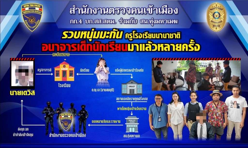 สตม. ได้รับการประสานข้อมูลจาก สน.ทุ่งมหาเมฆ กรณีผู้ต้องหาตามหมายจับศาลอาญากรุงเทพใต้ ที่ 766/66 ลง 22 ส.ค.66 ผู้ต้องหาชื่อ นายเดวิส (นามสมมติ) อายุ 46 ปี สัญชาติอเมริกัน กระทำความผิดฐาน กระทำอนาจารแก่เด็กอายุไม่เกินสิบห้าปี โดยเด็กนั้นจะยินยอมหรือไม่ก็ตาม เหตุเกิดที่โรงเรียนแห่งหนึ่ง เขตสาทร กทม. พฤติการณ์การกระทำความผิด คือ เมื่อวันที่ 30 มิ.ย.66 มารดาของผู้เสียหาย ซึ่งเป็นเด็กหญิงอายุ 4 ปี ได้แจ้งความกับพนักงานสอบสวน สน.ทุ่งมหาเมฆ ว่า ขณะพักอาศัยอยู่ในบ้านพัก พี่เลี้ยงของผู้เสียหายพบเห็นผู้เสียหายใช้สองมือล้วงเข้าไปในกางเกงชั้นในซึ่งเป็นอวัยวะเพศของตน โดยผู้เสียหายแจ้งกับพี่เลี้ยงว่า นายเดวิส ครูประจำโรงเรียนที่ผู้เสียหายกำลังศึกษาอยู่ มักจะใช้มือตีและถ่ายภาพอวัยวะเพศของผู้เสียหาย มารดาจึงพาผู้เสียหายไปตรวจร่างกายที่โรงพยาบาล และเข้าร้องกับสถานทูตฝรั่งเศสประจำประเทศไทยและมูลนิธิต่างๆ เพื่อประสานงานพาเข้าแจ้งความกับพนักงานสอบสวน เพื่อดำเนินคดีตามกฎหมาย