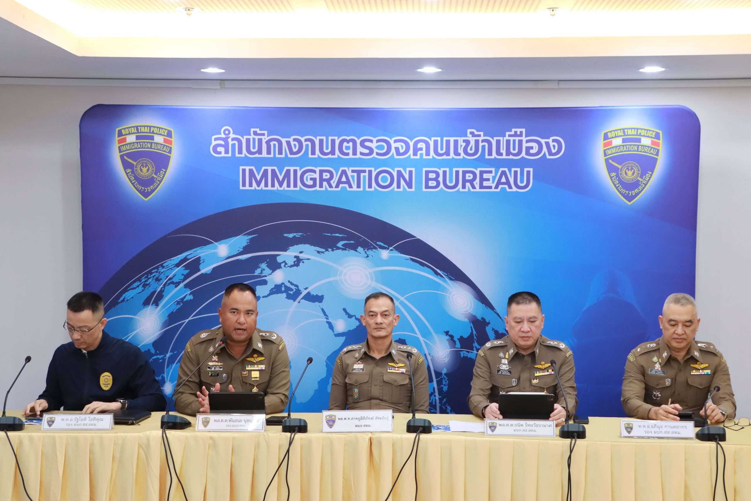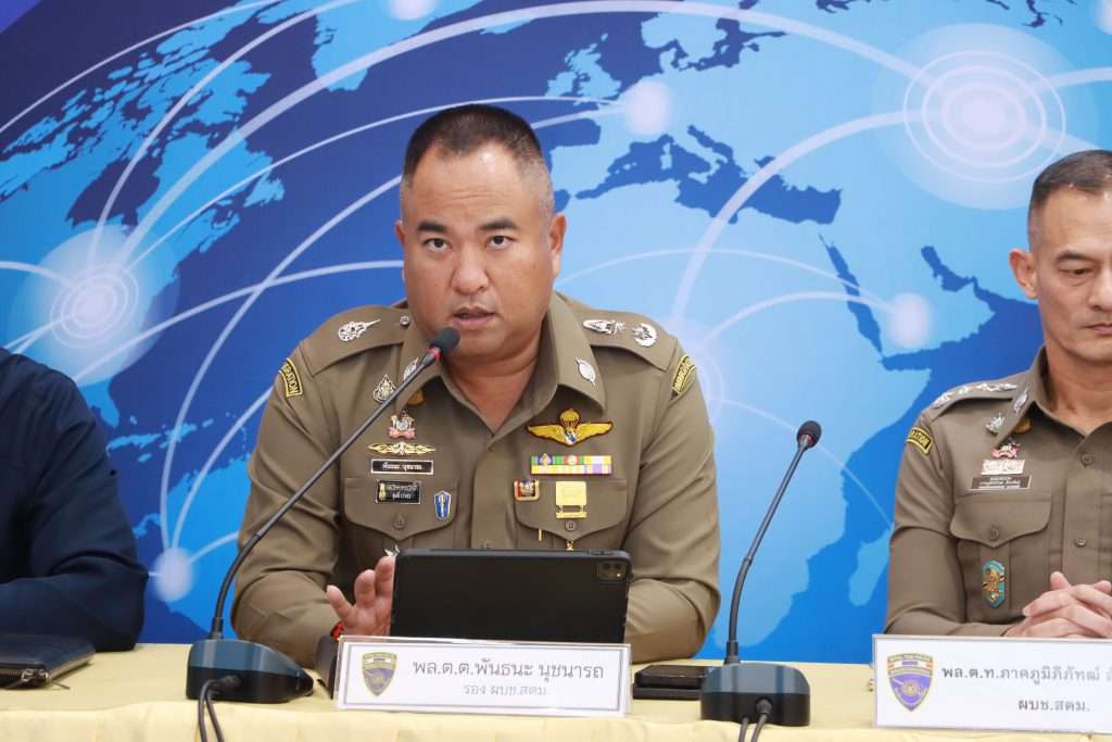 ภายใต้การอำนวยการของ พล.ต.ท.ภาคภูมิภิภัทฒ์ สัจจพันธุ์ ผบช.สตม., พล.ต.ต.พันธนะ นุชนารถ รอง ผบช.สตม., พล.ต.ต.ธนิต ไทยวัชรามาศ ผบก.สส.สตม., พ.ต.อ.อภิมุข กานตยากร รอง ผบก.สส.สตม., พ.ต.อ.รัฐโชติ โชติคุณ รอง ผบก.สส.สตม., พ.ต.อ.แดนไพร แก้วเวหล รอง ผบก.สส.สตม., พ.ต.อ.สุรศักดิ์ สุรินทร์แก้ว รอง ผบก.ศท.ตม.ปฏิบัติราชการ บก.สส.สตม., พ.ต.อ.ชิตเดชา สองห้อง รอง ผบก.สส.ภ.7 ปฏิบัติราชการ บก.สส.สตม., พ.ต.อ.สรธรรศจ์ เอี่ยมละออ ผกก.1 บก.สส.สตม., พ.ต.อ.พิสิษฐ์ ศรีอ่อน ผกก.2 บก.สส.สตม., พ.ต.อ.รัฐพงษ์ แก้วยอด ผกก.4 บก.สส.สตม., พ.ต.อ.ณภัทรพงศ สุภาพร ผกก.ปอพ.บก.สส.สตม., พ.ต.อ.ชย พานะกิจ ผกก.(สอบสวน) กลุ่มงานสอบสวน บก.สส.สตม. ร่วมแถลงข่าวการจับกุมผู้ต้องหารายสำคัญ ดังนี้