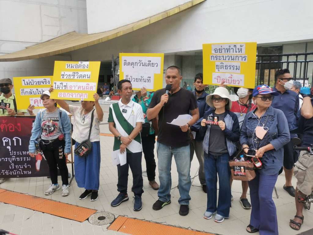 วันที่ 31 ส.ค.66 เวลา 16.30 น.ที่หน้าหอศิลป์ฯ กลุ่มเครือข่ายนักศึกษาประชาชนปฏิรูปประเทศไทย นำโดย นายพิชิต ไชยมงคล แกนนำกลุ่ม คปท.นำเครือข่ายรณรงค์แจกสติ้กเกอร์ “นช.ทักษิณต้องติดคุก” โดยบริเวณด้านหน้าหอศิลป์ได้มีการนำคุกจำลองและสแตนดี้ เป็นภาพคล้ายนายทักษิณ ชินวัตร ที่ใส่ชุดสีส้ม และกุญแจมืออยู่ด้านใน โดยด้านข้างคุกจำลองได้มีการติดป้ายความว่า “ทักษิณต้องติดคุกประเทศมีกระบวนการยุติธรรมเรือนจำมีไว้ขังนักโทษ” พร้อมอ่านแถลงการณ์ร้องถึงกรมราชทัณฑ์ และโรงพยาบาลตำรวจความว่า ให้ช่วยคำนึงถึงหลักความยุติธรรม ที่จำเป็นต้องปฏิบัติให้เท่าเทียมกับทุกคน โดยผู้ต้องขังที่เจ็บป่วยมีกระบวนการที่โรงพยาบาลราชทัณฑ์มีการรับรองไว้อยู่แล้ว แต่การเอื้อประโยชน์ แค่นายทักษิณ ชินวัตร เป็นการเฉพาะนั้นทำให้ตั้งคำถามว่า “ป่วยจริงหรือไม่” การกระทำในลักษณะนี้เข้าข่าย ”ทุจริตความยุติธรรม” ซึ่งส่งผลต่อการดำรงไว้ซึ่งความศักสิทธิ์ที่ควรเคารพแก่ประชาชนไทยทุกคน และต้องการเรียกร้องให้อธิบดีกรมราชทัณฑ์ และแพทย์ใหญ่โรงพยาบาลตำรวจ แสดงความรับผิดชอบต่อกรณีดังกล่าว และรีบปฏิบัติให้ถูกต้องตามระเบียบราชทัณฑ์ด้วยการคืนนักโทษสู่เรือนจำให้เร็วที่สุด