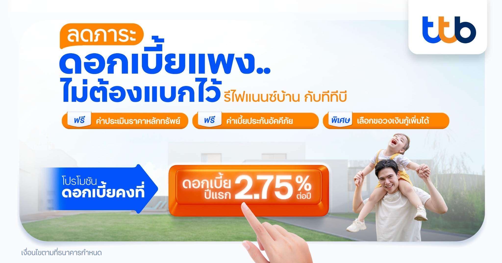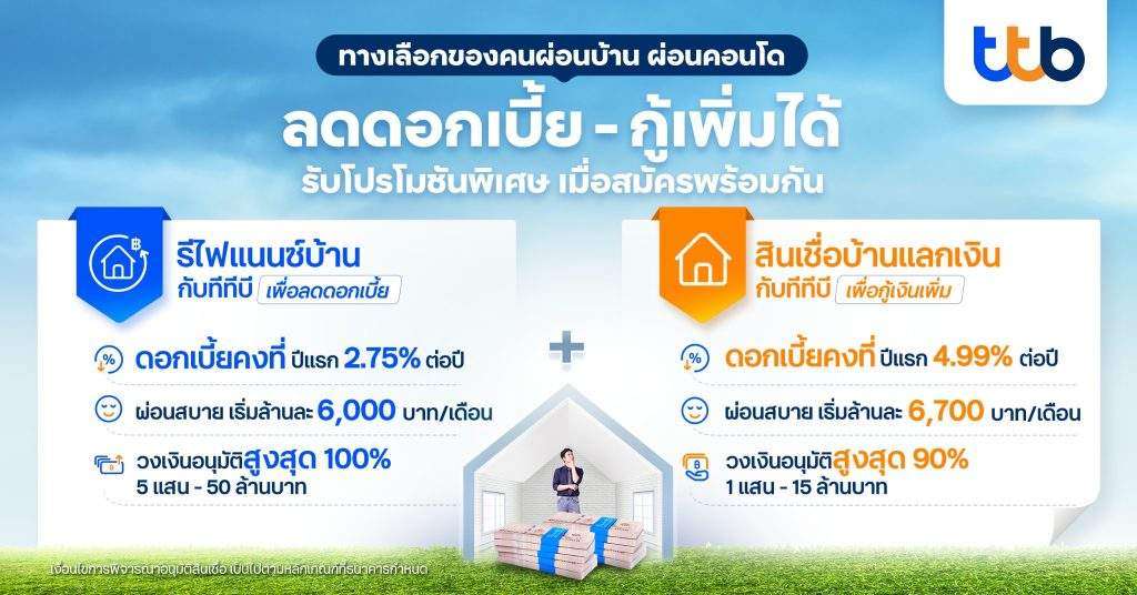 ทีเอ็มบีธนชาต หรือ ทีทีบี ตอกย้ำพันธกิจช่วยให้ “คนมีบ้าน” มีชีวิตทางการเงินดีขึ้น ส่งสินเชื่อบ้านรีไฟแนนซ์เป็นโซลูชันช่วยลูกค้าผ่อนหนักให้เป็นเบาในช่วงภาวะดอกเบี้ยขาขึ้น ลดภาระดอกเบี้ย ยอดผ่อนต่อเดือนลดลง พร้อมโปรโมชันดอกเบี้ยพิเศษ ทั้งแบบคงที่และลอยตัว เฉลี่ย 3 ปีแรกเริ่มต้น 3.25% ต่อปี ผ่อนเบาเริ่มต้นล้านละ 6,000 บาท/เดือน ฟรีค่าใช้จ่ายต่าง ๆ ช่วยลูกค้าประหยัดเงิน พิเศษ! ขอวงเงินกู้เพิ่ม ไว้เสริมสภาพคล่องได้อีกด้วย