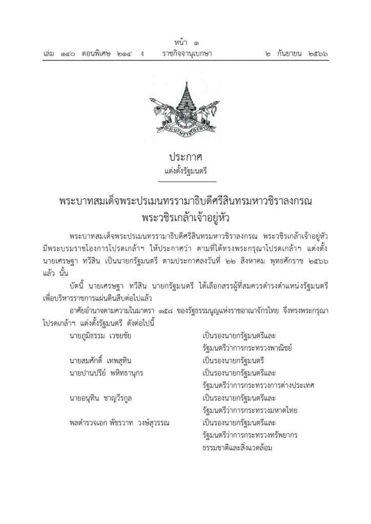 บัดนี้ นายเศรษฐษ ทวีสิน นายกรัฐมนตรี ได้เลือกสรรผู้ที่สมควรดำรงตำแหน่ง รัฐมนตรีเพื่อบริหารราชการแผ่นดินสืบต่อไปแล้ว อาศัยอำนาจตามความในมาตรา 158 ของรัฐธรรมนูญแห่งราชอาณาจักรไทย จึงทรงพระกรุณาโปรดเกล้าฯ แต่งตั้งรัฐมนตรี ดังต่อไปนี้ ประกาศ ณ วันที่ 1 ก.ย.2566 เป้นปีที่ 8 ในรัชกาลปัจจุบัน ผู้รับสนองพระราชโองการ เศรษฐา ทวีสิน รายนามคณะรัฐมนตรี มีรายชื่อดังต่อไปนี้
