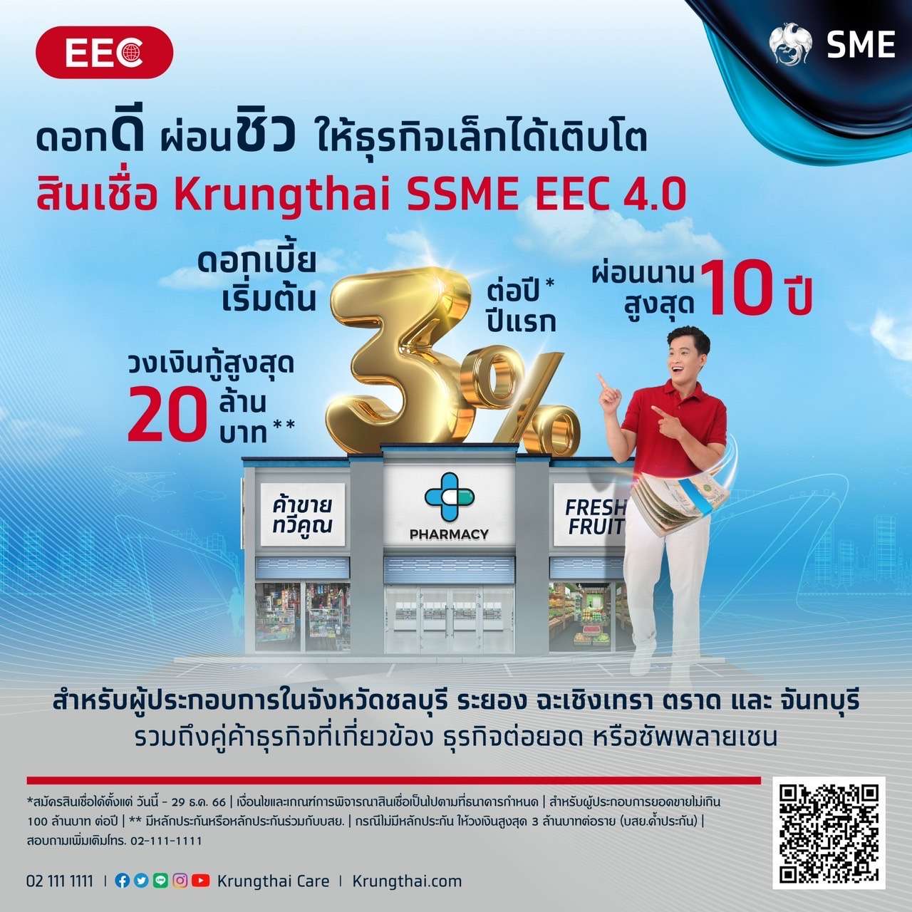 ภายในงานนี้ ธนาคารเสริมสภาพคล่องลูกค้าธุรกิจ ด้วยสินเชื่อ Krungthai SSME EEC 4.0 สำหรับผู้ประกอบการในจังหวัดระยอง ชลบุรี ฉะเชิงเทรา ตราด และจันทบุรี ดอกเบี้ยเริ่มต้น 3% ต่อปี วงเงินกู้สูงสุด 20 ล้านบาท ผ่อนนานสูงสุด 10 ปี สินเชื่อ SME ดอกเบี้ยเริ่มต้น 4.5% ต่อปี วงเงินกู้สูงสุด 20 ล้านบาท ผ่อนนานสูงสุด 20 ปี สินเชื่อ SME วงเงินสูง×3 รับวงเงินสูงสุด 3 เท่าของมูลค่าหลักประกัน สูงสุด 20 ล้านบาท ดอกเบี้ยเริ่มต้น MRR+2.5% ต่อปี ผ่อนนานสูงสุด 7 ปี สนับสนุนลูกค้าบุคคลเข้าถึงแหล่งเงินทุน ผ่านสินเชื่อกรุงไทย Smart Money สำหรับผู้มีรายได้ประจำแต่ไม่มีบัญชีเงินเดือนกับธนาคาร วงเงินกู้สูงสุด 5 เท่าของรายได้ ผ่อนนาน 5 ปี ไม่ต้องมีหลักประกัน สินเชื่ออเนกประสงค์สำหรับข้าราชการและพนักงานรัฐวิสาหกิจ วงเงินกู้สูงสุด 2 ล้านบาท ดอกเบี้ยพิเศษเริ่มต้น 7.57% ต่อปี ผ่อนนานสูงสุด 20 ปี ไม่ต้องมีหลักทรัพย์ค้ำประกัน เพียงมีรายได้ตั้งแต่ 13,000 บาทต่อเดือนขึ้นไป