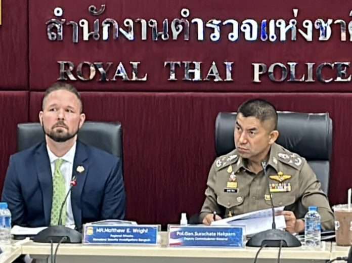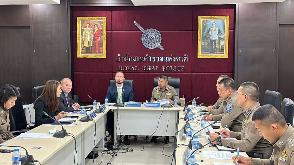 วันที่ 7 กันยายน 2566 เวลา 15.00 น. ณ ห้องประชุม 3 อาคาร 1 สำนักงานตำรวจแห่งชาติ พล.ต.อ.สุรเชษฐ์ หักพาล รองผู้บัญชาการตำรวจแห่งชาติ/ผู้อำนวยการศูนย์พิทักษ์ เด็ก สตรี ครอบครัว พร้อมด้วย พล.ต.ท.พนัญชัย ชื่นใจธรรม ผู้ทรงคุณวุฒิพิเศษ สำนักงานตำรวจแห่งชาติ พล.ต.ต.ฐิตวัฒน์ สุริยฉาย ผู้บังคับการตำรวจสีบสวนสอบสวนอาชญากรรมทางเทคโนโลยี 4 รองหัวหน้าชุดปฏิบัติการต่อต้านการค้ามนุษย์ และคณะ ได้ให้การต้อนรับ MR.Matthew E. Wright Regional Attache Homeland Security Investigations Bangkok และ MR.Jacob T. Carlyle Assistant Attache Homeland Security Investigations Bangkok เจ้าหน้าที่ระดับสูงของ สำนักงานสืบสวนความมั่นคงแห่งมาตุภูมิ กระทรวงความมั่นคงแห่งมาตุภูมิสหรัฐอเมริกา
