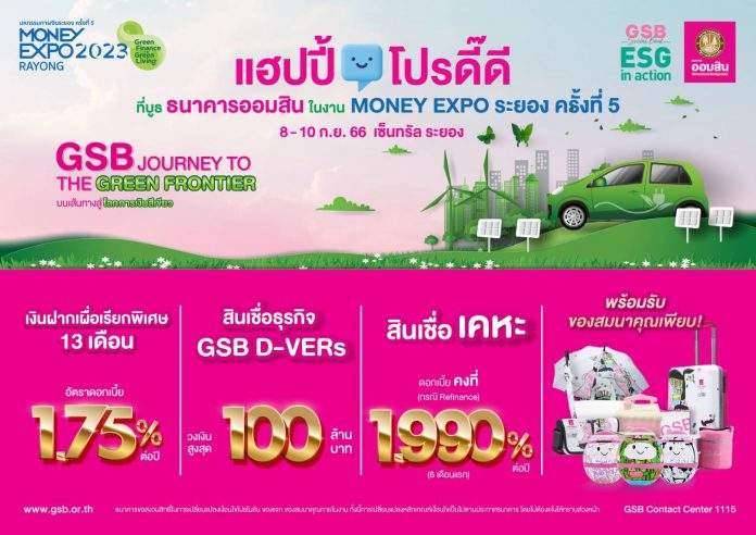 ธนาคารออมสิน เข้าร่วมงาน Money Expo ระยอง ครั้งที่ 5 ระหว่างวันที่ 8-10 ก.ย. 2566 ณ เซ็นทรัล ระยอง ภายใต้แนวคิด “GSB Journey to The Green Frontier : บนเส้นทางสู่โลกการเงินสีเขียว” สอดคล้องยุทธศาสตร์ธนาคารเพื่อสังคมที่มุ่งเน้นดำเนินการตามกรอบ ESG in action สู่การพัฒนาที่ยั่งยืน โดยให้ความสำคัญตั้งแต่กระบวนการจัดทำบูธที่เลือกใช้วัสดุที่เป็นมิตรต่อสิ่งแวดล้อม พร้อมนำเสนอโปรโมชันน่าสนใจในงานนี้ ทั้งผลิตภัณฑ์เงินฝากส่งเสริมการออมสำหรับทุกวัย สินเชื่อบ้าน สินเชื่อบุคคล และสินเชื่อธุรกิจ ที่เข้ากับกระแสรักษ์โลก
