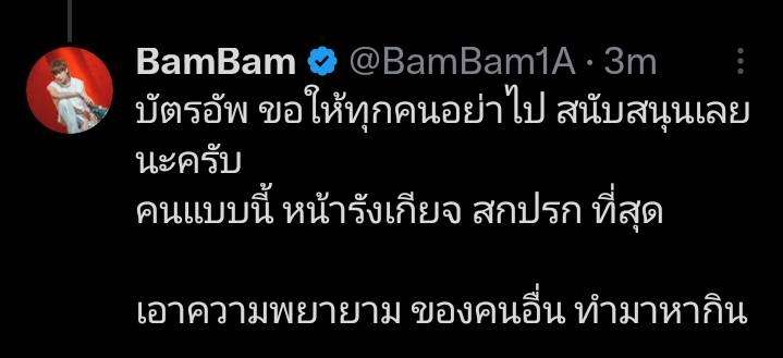 ทั้งนี้ “แบมแบม”ยังพร้อมตอบกลับแฟนคลับที่โพสต์ตัดพ้อว่าบัตรอัพมีราคาที่แพงมาก สูงถึง5-6หมื่นบาท โดยแบมแบมฟาดถึงคนที่ขายบัตรอัพราคาว่า