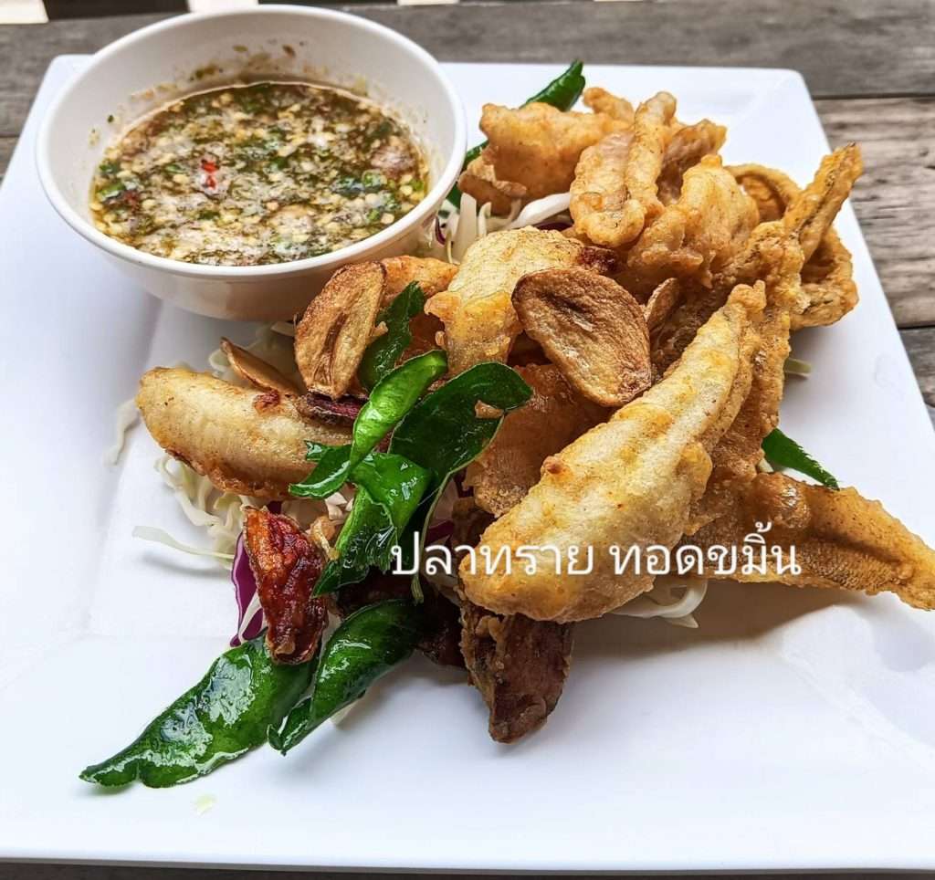 ปลาทรายและเนื้อออกมาขาวๆ คลุกกับขมิ้นบางๆ เน้นขมิ้นเป็นชิ้น ทอดปลาออกมาได้กรอบนอกนุ่มใน ถือว่าเด็ด ปลาทรายทอดขมิ้น จานนี้ 180 บาท