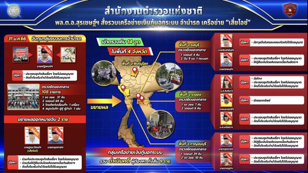 พล.ต.อ.สุรเชษฐ์ กล่าวว่า จากกรณีเมื่อวันที่ 31 ม.ค.66 เจ้าหน้าที่ตำรวจ ศปน.ภ.2 ได้ทำการจับกุม นายณัฐพงษ์ หรือโจ้ (สงวนนามสกุล) อายุ 36 ปี พร้อมตรวจยึดของกลางเป็นรถจักรยานยนต์ จำนวน 37 คัน และรถยนต์ จำนวน 69 คัน ซึ่งเป็นรถของกลางที่ได้มาจากการรับจำนำรถโดยผิดกฎหมาย ดำเนินคดีในความผิดฐาน “ประกอบธุรกิจสินเชื่อส่วนบุคคลโดยไม่ได้รับอนุญาต และจัดตั้งโรงรับจำนำโดยไม่ได้รับอนุญาต” ตามที่สื่อมวลชนได้นำเสนอไปแล้วนั้น
