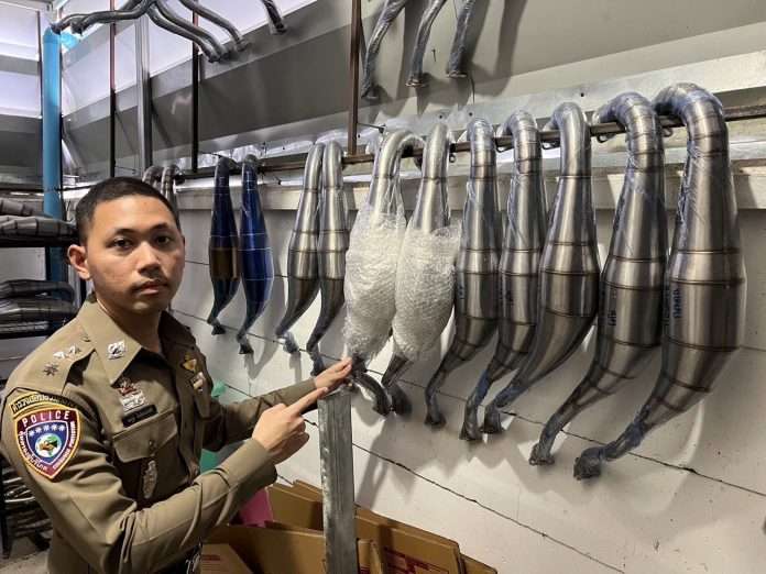 พร้อมตรวจยึดของกลาง ท่อไอเสียรถจักรยานยนต์แต่ง (แบบเต็มใบ) จำนวน 109 ชุด และปลายท่อไอเสียรถจักรยานยนต์แต่ง จำนวน 23 ชิ้น สถานตรวจค้น บ้านพักหลังหนึ่งในพื้นที่ หมู่ 7 ต.ปรุใหญ่ อ.เมืองนครราชสีมา จ.นครราชสีมา