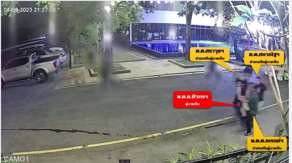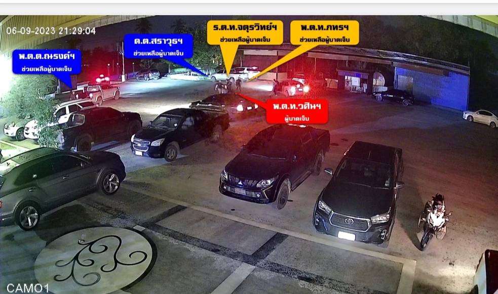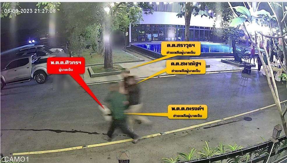 ต่อมา ตำรวจ 4 นาย ประกอบด้วย ด.ต.สราวุธ , พ.ต.ต.ณรงค์ , ร.ต.ท.จตุรวิทย์ และ พ.ต.ท.ภทร เข้าช่วยเหลือผู้บาดเจ็บ ซึ่งก็คือ พ.ต.ท.วศิน พันปี ที่ได้รับบาดเจ็บ โดย พ.ต.ต.ณรงค์ กระโดดขึ้นด้านหลังนั่งคู่ไปกับผู้บาดเจ็บ ส่วน ด.ต.สราวุธ เป็นคนขับ จากนั้นตำรวจอีก 2 นายนั่งอยู่ในรถ และจากนั้นรถก็ไปรากฎตามกล้องที่โรงพยาบาล(เมื่อวันที่ 15 กันยายน 2566)