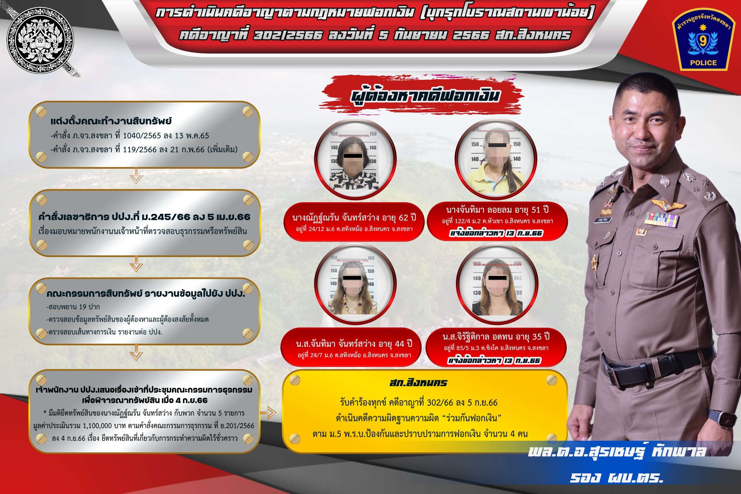 พล.ต.อ.สุรเชษฐ์ สั่งสืบสวนขยายผลคดีบุกรุกโบราณสถานเขาน้อย อ.สิงหนคร จ.สงขลา ดำเนินคดีฟอกเงิน ตรวจยึดทรัพย์ที่ดิน 5 แปลง มูลค่ารวมกว่า 1 ล้านบาท