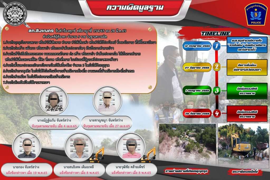 พร้อมตรวจยึด รถแบ็คโฮ ยี่ห้อโคมัทสุ สีเหลือง จำนวน 1 คัน ดำเนินคดีในฐานความผิด 7 ข้อหา ได้แก่ (1)ร่วมกันบุกรุกโบราณสถาน พรบ.โบราณสถานฯ (2)ร่วมกันก่อสร้าง แผ้วถาง หรือเผาป่า หรือกระทำด้วยประการใดๆ อันเป็นการทำลายป่าฯ พรบ.ป่าไม้ฯ (3)ร่วมกันเข้าไปยึดถือครอบครอง…ก่น สร้าง หรือ…ทำด้วยประการใด ทำลาย หรือทำให้เสื่อมสภาพที่ดิน ที่หิน ที่กรวด หรือที่ทราย ป.ที่ดินฯ (4)ร่วมกันตั้งและประกอบกิจการโรงงานจำพวกที่ 3 โดยไม่ได้รับอนุญาต พรบ.โรงงานฯ (5)ร่วมกันทำการขุดดิน โดยไม่ได้รับใบรับแจ้งจากเจ้าพนักงานท้องถิ่น พรบ.การขุดดินฯ (6) ร่วมกันทำเหมือง โดยไม่รับประทานบัตรเจ้าพนักงาน พรบ.แร่ฯ และ (7)ร่วมกันลักทรัพย์โดยใช้ยานพาหนะฯ ป.อาญาฯ