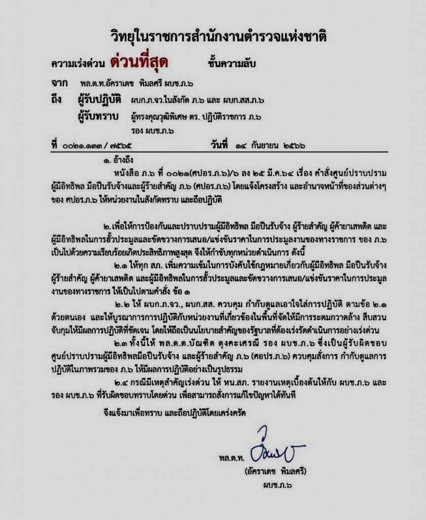 เมื่อวันที่ 16 กันยายน 2566 พล.ต.ท.อัคราเดช พิมลศรี ผบช.ก.6 ได้หนังสือคำสั่งวิทยุในราชการ ถึง ผู้รับปฏิบัติ ผบก.ภ.จว.ในสังกัด ภ. และ ผบก.สส.ภ.6