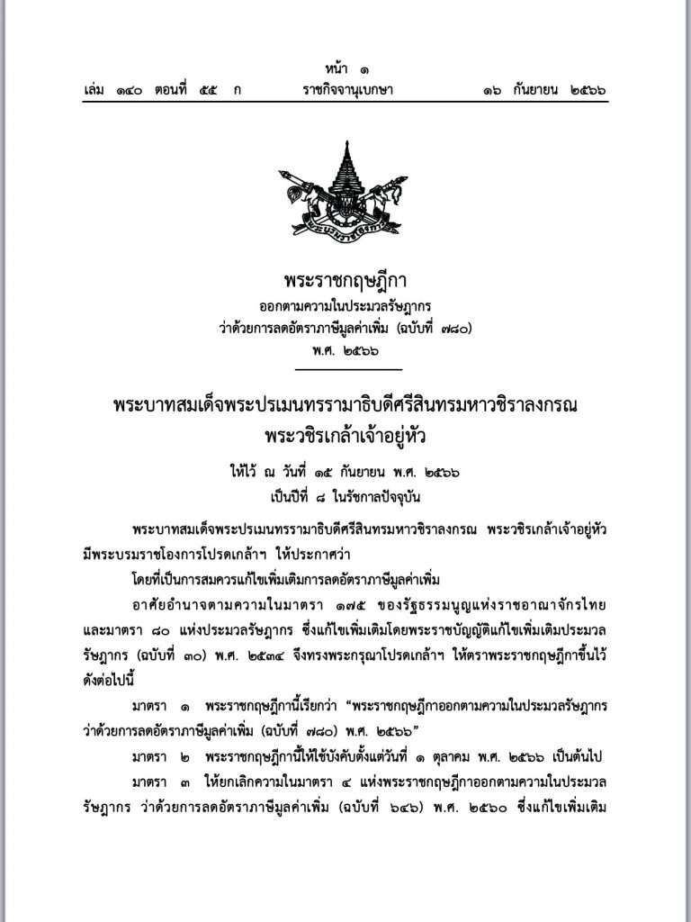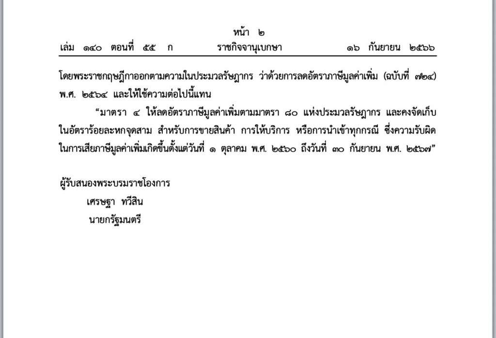ผู้สื่อข่าวไทยแทบลอยรายงานว่าได้มี ราชกิจจานุเบกษา มีใจความระบุว่า : พระราชกฤษฎีกาออกตามความในประมวลรัษฎากรว่าด้วยการลดอัตราภาษีมูลค่าเพิ่ม (ฉบับที่ 780)พ.ศ. 2566