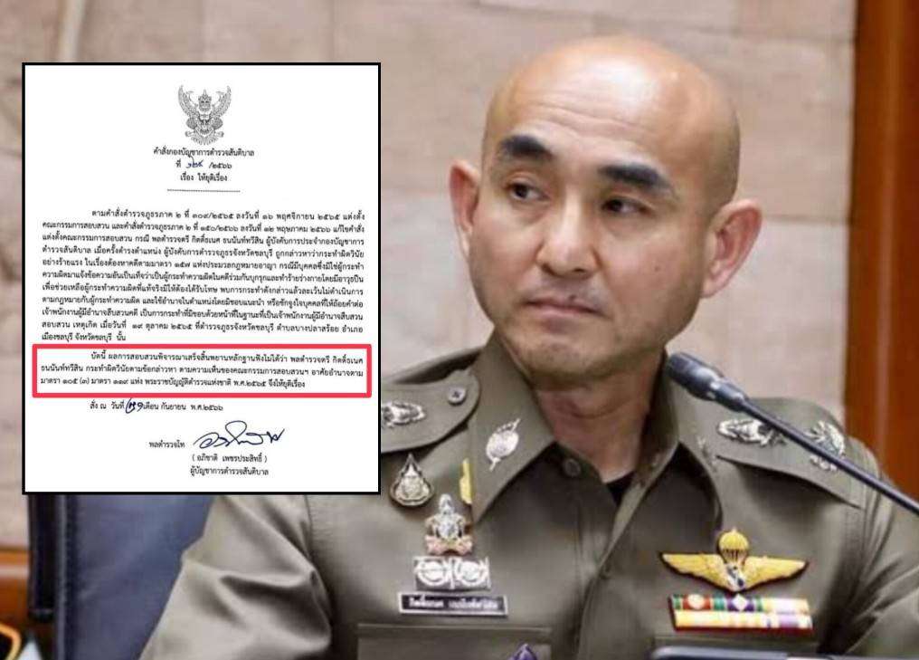 ตามคำสั่งตำรวจภูธรภาค 2 ที่ 309/2565 ลงวันที่ 16 พฤศจิกายน 2565 แต่งตั้ง คณะกรรมการสอบสวน และคำสั่งตำรวจภูธรภาค 2 ที่ 150/2566 ลงวันที่ 12 พฤษภาคม 2566 แก้ไขคำสั่ง แต่งตั้งคณะกรรมการสอบสวน กรณีพล.ต.ต.กิตติ์ธเนศ ธนนันท์ทวีสิน ผู้บังคับการประจำกองบัญชาการตำรวจสันติบาล เมื่อครั้งดำรงตำแหน่ง ผู้บังคับการตำรวจภูธรจังหวัดชลบุรี ถูกกล่าวหาว่ากระทำผิดวินัยอย่างร้ายแรง ในเรื่องต้องหาคดีตามมาตรา 157 แห่งประมวลกฎหมายอาญา กรณีมีบุคคลซึ่งมิใช่ผู้กระทำ ความผิดมาแจ้งข้อความอันเป็นเท็จว่าเป็นผู้กระทำความผิดในคดีร่วมกันบุกรุกและทำร้ายร่างกายโดยมีอาวุธปืน เพื่อช่วยเหลือผู้กระทำความผิดที่แท้จริงมิให้ต้องได้รับโทษ พบการกระทำดังกล่าวแล้วละเว้นไม่ดำเนินการ ตามกฎหมายกับผู้กระทำความผิด และใช้อำนาจในตำแหน่งโดยมิชอบแนะนำ หรือชักจูงใจบุคคลที่ให้ถ้อยคำต่อ เจ้าพนักงานผู้มีอำนาจสืบสวนคดี เป็นการกระทำที่มิชอบด้วยหน้าที่ในฐานะที่เป็นเจ้าพนักงานผู้มีอำนาจสืบสวน สอบสวน เหตุเกิด เมื่อวันที่ 19 ตุลาคม 2565 ที่ตำรวจภูธรจังหวัดชลบุรี ตำบลบางปลาสร้อย อำเภอเมืองชลบุรี จังหวัดชลบุรี นั้น