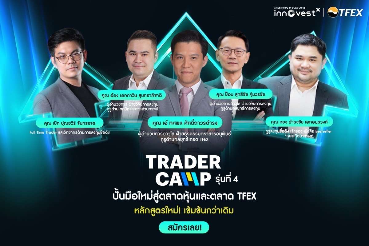 “Trader Camp by InnovestX รุ่นที่ 4” อันแน่นไปด้วยกิจกรรมติวเข้มทั้งในรูปแบบ Online และ Onsite ที่รวบรวมทุกองค์ความรู้และเผยทุกเคล็ดลับการเทรด อาทิ คอร์สติวเข้มเทรดหุ้นและ TFEX เทคนิคการจับกลยุทธ์การเทรดหุ้นและ TFEX , เทคนิคจากกูรูขั้นเซียน ในหัวข้อถอดรหัสวิธีคิดเทรดเดอร์มืออาชีพ นอกจากนี้ผู้เรียนจะได้ Workshop ฝึกเทรดกับผู้เชี่ยวชาญตัวจริงพร้อมกิจกรรมแข่งขันเทรด ชิงถ้วยและเงินรางวัล พร้อมรับใบรับรอง (E-Certificate) จาก InnovestX หลังจบหลักสูตร และเปิดโอกาสให้ผู้เข้าร่วมได้ลงสนามเพื่อทดลองเทรดในสถานการณ์จริงกับผู้เชี่ยวชาญการลงทุนจาก บล. อินโนเวสท์ เอกซ์ นำโดย “คุณเอ๋-ทศพล ศักดิ์ถาวรดำรง” ผู้อำนวยการอาวุโส ฝ่ายธุรกรรมตราสารอนุพันธ์ กูรูด้านกลยุทธ์การเทรดในตลาด TFEX “คุณอ๋อง-เอกภาวิน สุนทราภิชาติ” ผู้อำนวยการ ฝ่ายวิจัยการลงทุน กูรูด้านเทคนิคและการอ่านกราฟ และ “คุณป๊อบ-สุทธิชัย คุ้มวรชัย” ผู้อำนวยการอาวุโส ฝ่ายวิจัยการลงทุน กูรูด้านกลยุทธ์การลงทุน ตลอดจนกูรูผู้ทรงคุณวุฒิ และมากประสบการณ์ อาทิ คุณเป๊ก-ปุณยวีร์ จันทรขจร Full Time Trader คุณหยง-ธำรงชัย เอกอมรวงศ์ กูรูลงทุนชื่อดัง เจ้าของหนังสือ Bestseller “หยงเกิดมาเทรด” ที่จะมาร่วมเปิดประสบการณ์และถอดรหัสวิธีการคิดตามแบบฉบับนักเทรดมืออาชีพ เพื่อให้นักลงทุนไทยสามารถแสวงหาโอกาสและสร้างรายได้จากการลงทุนในตลาดหุ้นและตลาด TFEX ในทุกสภาวะตลาด โดย Trader Camp by InnovestX ได้มีการเปิดให้ความรู้การลงทุนมาแล้ว 3 ครั้งในปีนี้ และมีนักลงทุนใน Community เรามากกว่า 4,300 คนที่ผู้เข้าร่วมจะได้แลกเปลี่ยนความรู้ลงทุนกับเพื่อนๆ นักลงทุนด้วยกัน