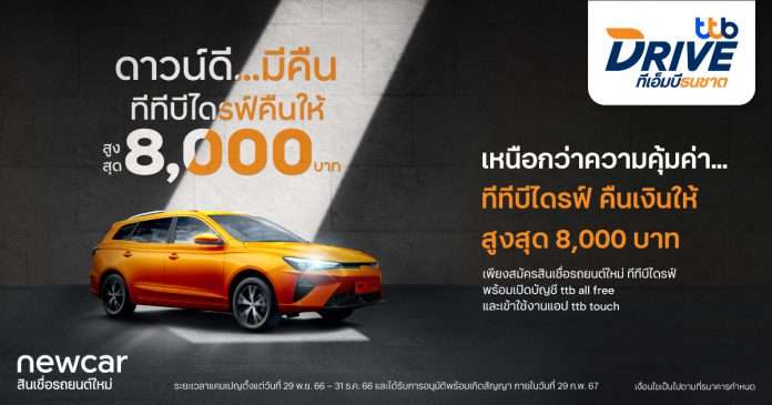 ทีทีบีไดรฟ์ โดยทีเอ็มบีธนชาต ผู้นำในตลาดสินเชื่อรถยนต์ มุ่งมั่นส่งมอบประสบการณ์และบริการที่ดี เพื่อให้คนไทยมีชีวิตทางการเงินที่ดีขึ้นรอบด้าน จัดโปรโมชันหนักส่งท้ายปีสำหรับผู้ต้องการมีรถ เมื่อออกรถยนต์ใหม่ภายในงาน Motor Expo 2023 พร้อมสมัครสินเชื่อรถยนต์ใหม่ ทีทีบีไดรฟ์ จะได้รับเงินคืนถึง 3 ต่อ สูงสุดไม่เกิน 8,000 บาท พร้อมของสมนาคุณและสิทธิพิเศษอื่น ๆ จากบัตรเครดิต ttb