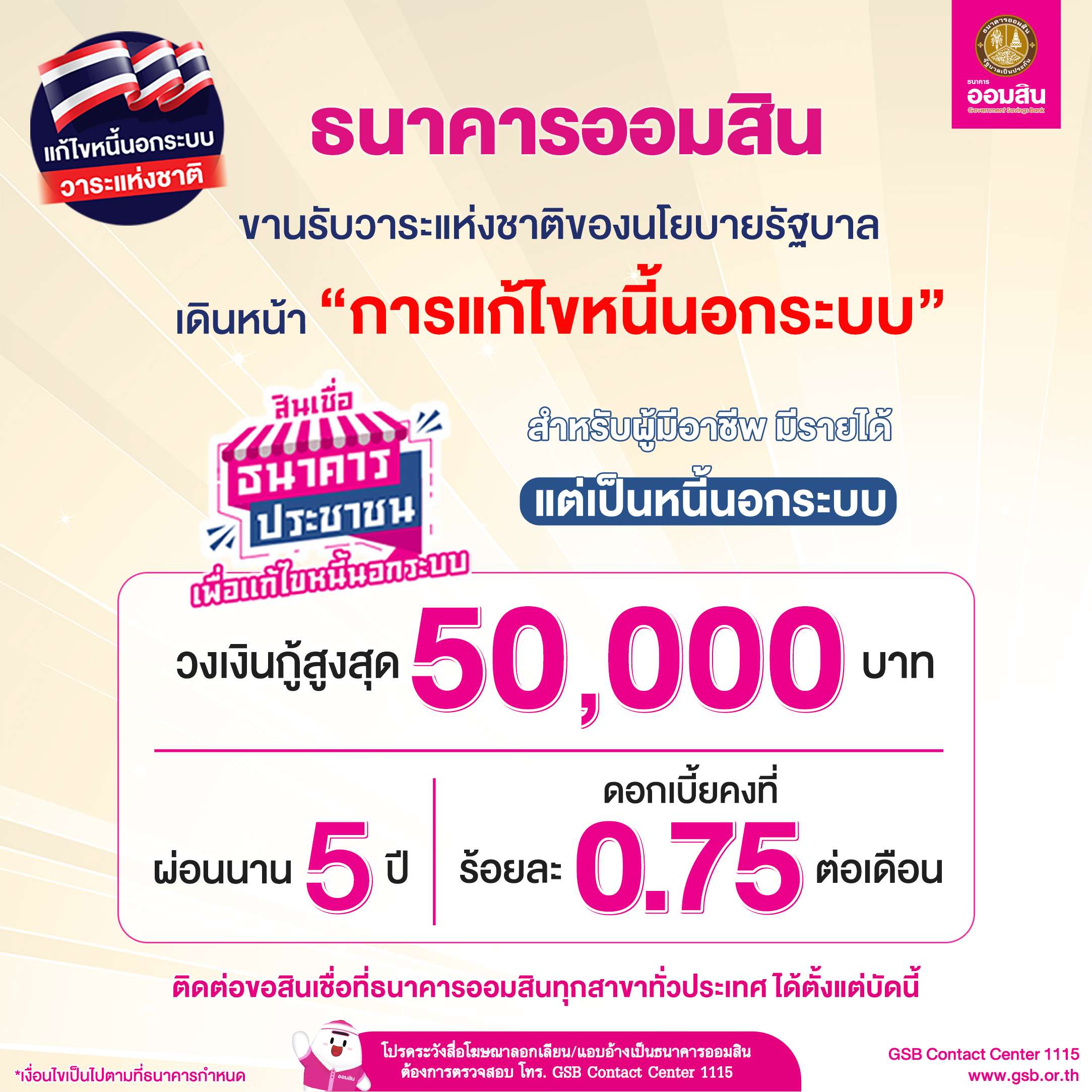ธนาคารออมสิน รับมอบนโยบายตามที่นายเศรษฐา ทวีสิน นายกรัฐมนตรีและรัฐมนตรีว่าการกระทรวงการคลัง ประกาศเดินหน้า “การแก้ไขหนี้นอกระบบ” เป็นวาระแห่งชาติ โดยธนาคารพร้อมขับเคลื่อนภารกิจขานรับนโยบายรัฐ ตามข้อสั่งการของรัฐมนตรีช่วยว่าการกระทรวงการคลัง นายกฤษฎา จีนะวิจารณะ ให้ธนาคารออมสินช่วยเหลือลูกหนี้เงินกู้นอกระบบที่เดือดร้อนจากการนำเงินกู้ไปใช้ประกอบอาชีพ โดยธนาคารเปิดให้กู้ “สินเชื่อธนาคารประชาชน เพื่อแก้ไขหนี้นอกระบบ” เพื่อใช้บรรเทาความเดือดร้อนภาระหนี้นอกระบบที่มีอยู่ ทั้งนี้ ผู้มีสิทธิ์ยื่นกู้เป็นผู้ที่ประกอบอาชีพ มีรายได้ อายุ 20 ปีขึ้นไป ไม่เกิน 65 ปีเมื่อรวมอายุตัวกับระยะเวลาชำระคืนเงินกู้ วงเงินให้กู้รายละไม่เกิน 50,000 บาท อัตราดอกเบี้ยเริ่มต้น 0.75% ต่อเดือน (Flat Rate) ระยะเวลาชำระคืนเงินกู้สูงสุดไม่เกิน 5 ปี หรือ 60 งวด สามารถใช้บุคคลหรือหลักทรัพย์อื่นเป็นหลักประกันได้