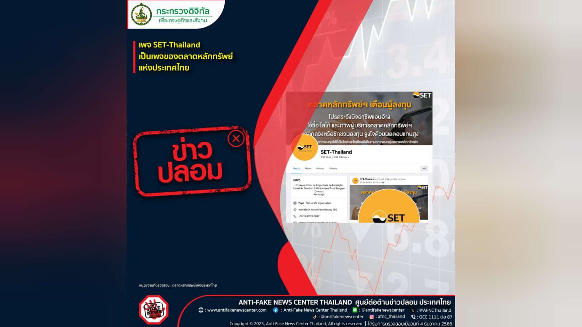 ตามที่มีการเผยแพร่ข้อมูลว่าเพจ SET-Thailand เป็นเพจของตลาดหลักทรัพย์แห่งประเทศไทย ทางศูนย์ต่อต้านข่าวปลอมได้ดำเนินการตรวจสอบข้อเท็จจริงร่วมกับตลาดหลักทรัพย์แห่งประเทศไทย พบว่าข้อมูลดังกล่าว เป็นข้อมูลเท็จ