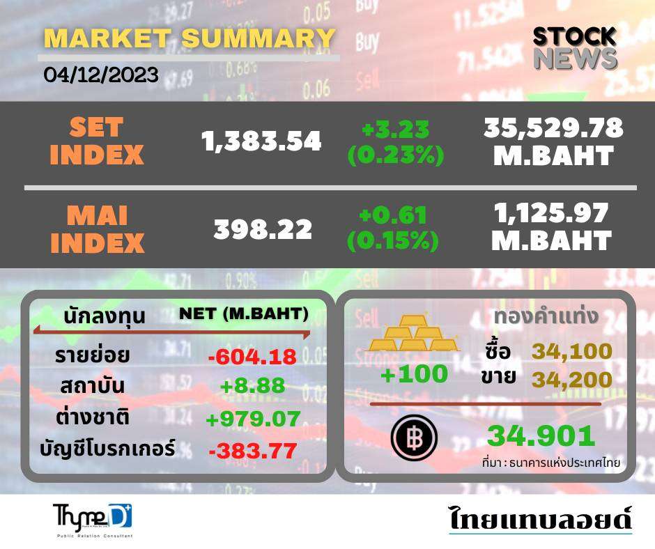 SET ปิดวันนี้ที่ 1,383.54 จุด เพิ่มขึ้น 3.23 จุด (+0.23%) มูลค่าซื้อขาย 35,519.36 ล้านบาท