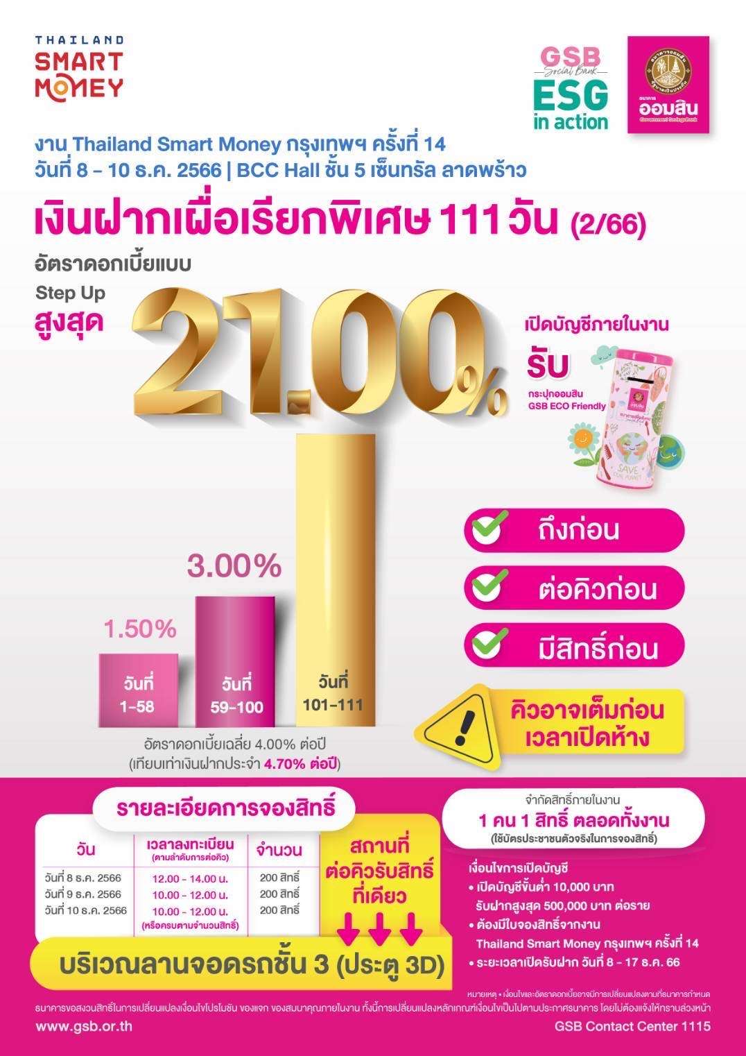 ธนาคารออมสิน เข้าร่วมงาน Thailand Smart Money กรุงเทพฯ ครั้งที่ 14 จัดโปรโมชันน่าสนใจเข้าร่วมในงาน นี้ ทั้งผลิตภัณฑ์เงินฝากส่งเสริมการออมสำหรับทุกวัย สินเชื่อบ้าน สินเชื่อบุคคล และสินเชื่อรักษ์โลก โดยผลิตภัณฑ์เงินฝากไฮไลท์ ได้แก่ เงินฝากเผื่อเรียกพิเศษ 111 วัน ระยะเวลาฝาก 111 วัน ดอกเบี้ย Step up สูงสุด 21.00% ต่อปี คิดเป็นอัตราดอกเบี้ยเฉลี่ย 4.00% ต่อปี ได้รับยกเว้นภาษี รับฝากเฉพาะบุคคลธรรมดา จำนวน 600 สิทธิ์ เปิดจองสิทธิ์ภายในงานเท่านั้น และ สลากออมสินพิเศษ 2 ปี จัดแคมเปญรอบใหม่ต่อเนื่อง ด้วยการเพิ่มรางวัลพิเศษมูลค่า 50 ล้านบาท 1 รางวัล และยังมีสิทธิ์ถูกรางวัลที่ 1 อีก 30 ล้านบาท รวมเงินรางวัลใหญ่ 80 ล้านบาท สำหรับผู้ฝากทั้งแบบใบสลากและดิจิทัล เริ่มฝากตั้งแต่บัดนี้เป็นต้นไป ถึงวันที่ 31 ม.ค. 2567 กำหนดจับรางวัลวันที่ 1 ก.พ. 2567