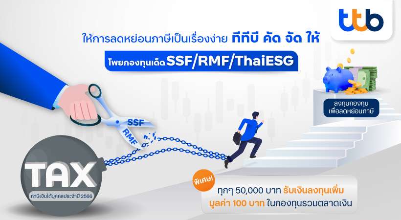 โค้งสุดท้ายกับแคมเปญ “Tax Saving 2023” ที่ ทีทีบี คัด จัดกองทุนรวมชั้นนำ กองทุนลดหย่อนภาษี SSF และ RMF ที่น่าสนใจ และกองทุนน้องใหม่ ThaiESG พร้อมแนะนำการลงทุนกับ ttb smart port SSF ลงทุนง่ายกับ 5 โมเดล เลือกได้ตามความเสี่ยงที่เหมาะสมกับผู้ลงทุน โดยมีผู้เชี่ยวชาญระดับโลกด้านการลงทุนอย่าง Amundi และ บลจ.อีสท์สปริง ดูแล คัด และปรับพอร์ตให้อัตโนมัติรับทุกสถานการณ์สำคัญ ปิดท้ายด้วยโปรโมชันพิเศษ เมื่อซื้อหรือสับเปลี่ยนเข้ากองทุน SSF RMF หรือ ThaiESG ที่เข้าร่วมรายการ หรือโอนกองทุน LTF จาก บลจ. อื่น เข้ากองทุน LTF ของ บลจ. 5 แห่งที่เข้าร่วมโปรโมชัน ทุก 50,000 บาทของการลงทุนในแต่ละบลจ. (ตามบลจ. ที่ได้ลงทุน) รับเงินลงทุนเพิ่มในกองทุนรวมตลาดเงิน (Money Market) จำนวน 100 บาท ระยะเวลาโปรโมชันตั้งแต่วันนี้ถึง 28 ธันวาคม 2566