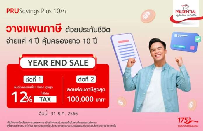 พรูเด็นเชียล ประเทศไทย จัดเต็มกับแคมเปญส่งท้ายปี Year End Sale กับการวางแผนภาษีส่งท้ายปี 2023 ด้วย PRUSavings Plus 10/4 ผลิตภัณฑ์ประกันชีวิตที่จ่ายค่าเบี้ยฯประกันภัยเพียง 4 ปี คุ้มครองยาวๆ 10 ปี และรับเงินคืนทุกปี ปีละ 5% ของจำนวนเงินเอาประกันภัย ณ สิ้นปีกรมธรรม์ปีที่ 1-9 พร้อมรับสิทธิพิเศษสุดคุ้ม 2 ต่อ ได้แก่ ต่อที่ 1 รับส่วนลดค่าเบี้ยประกันภัยปีแรกสูงสุด 12% และต่อที่ 2 สามารถลดหย่อนภาษีได้สูงสุด 100,000 บาท (ตามเกณฑ์สรรพากร) ตั้งแต่วันนี้ – 31 ธันวาคมนี้ โดยลูกค้าที่สนใจสามารถดูรายละเอียดผลิตภัณฑ์และโปรโมชันเพิ่มเติมได้ที่เว็บไซต์ https://