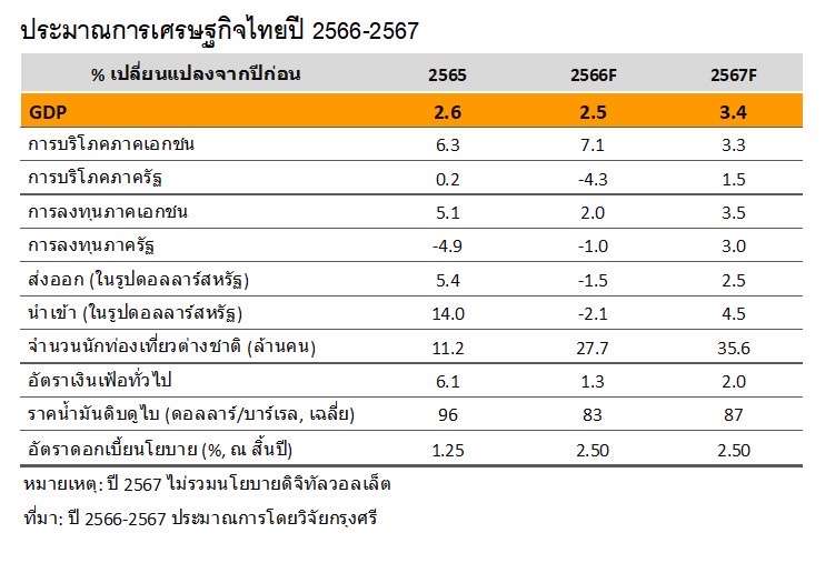 • คาดเศรษฐกิจไทยปีหน้าจะขยายตัวที่ 3.4% (ไม่รวมผลของนโยบายดิจิทัลวอลเล็ต) จาก 2.5% ในปี 2566