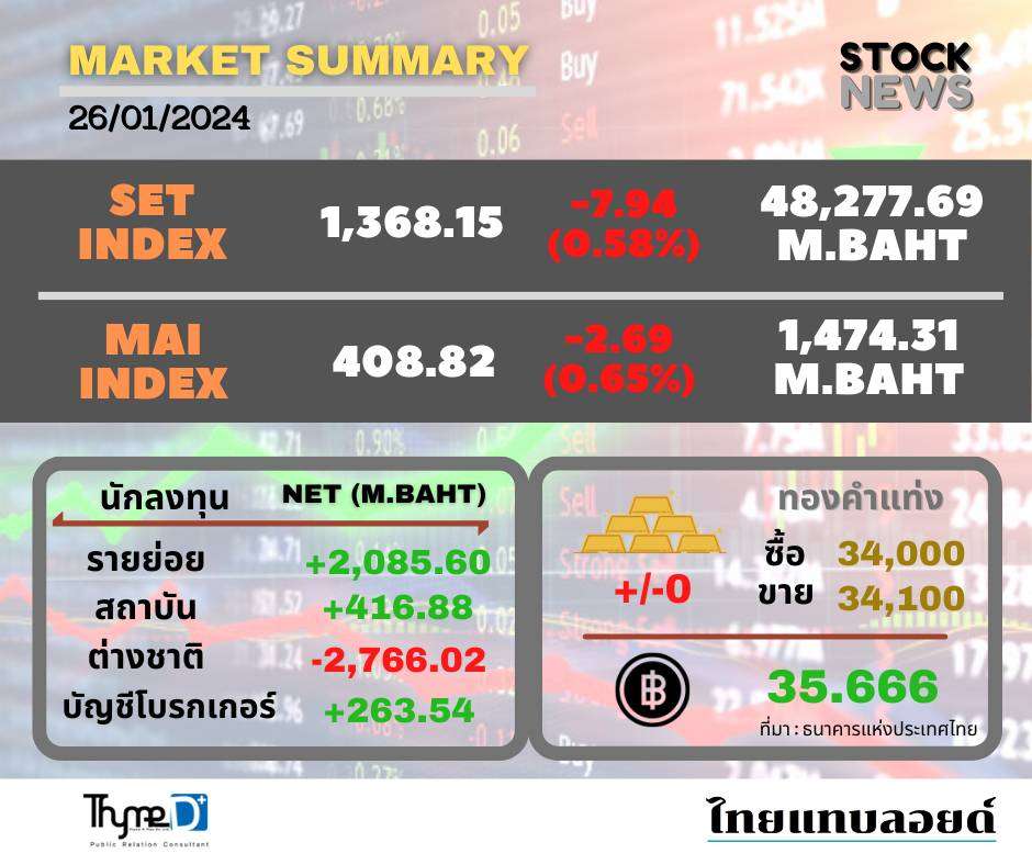 SET ปิดวันนี้ที่ 1,368.15 จุด ลดลง 7.94 จุด (-0.58%) มูลค่าซื้อขาย 48,277.69 ล้านบาท