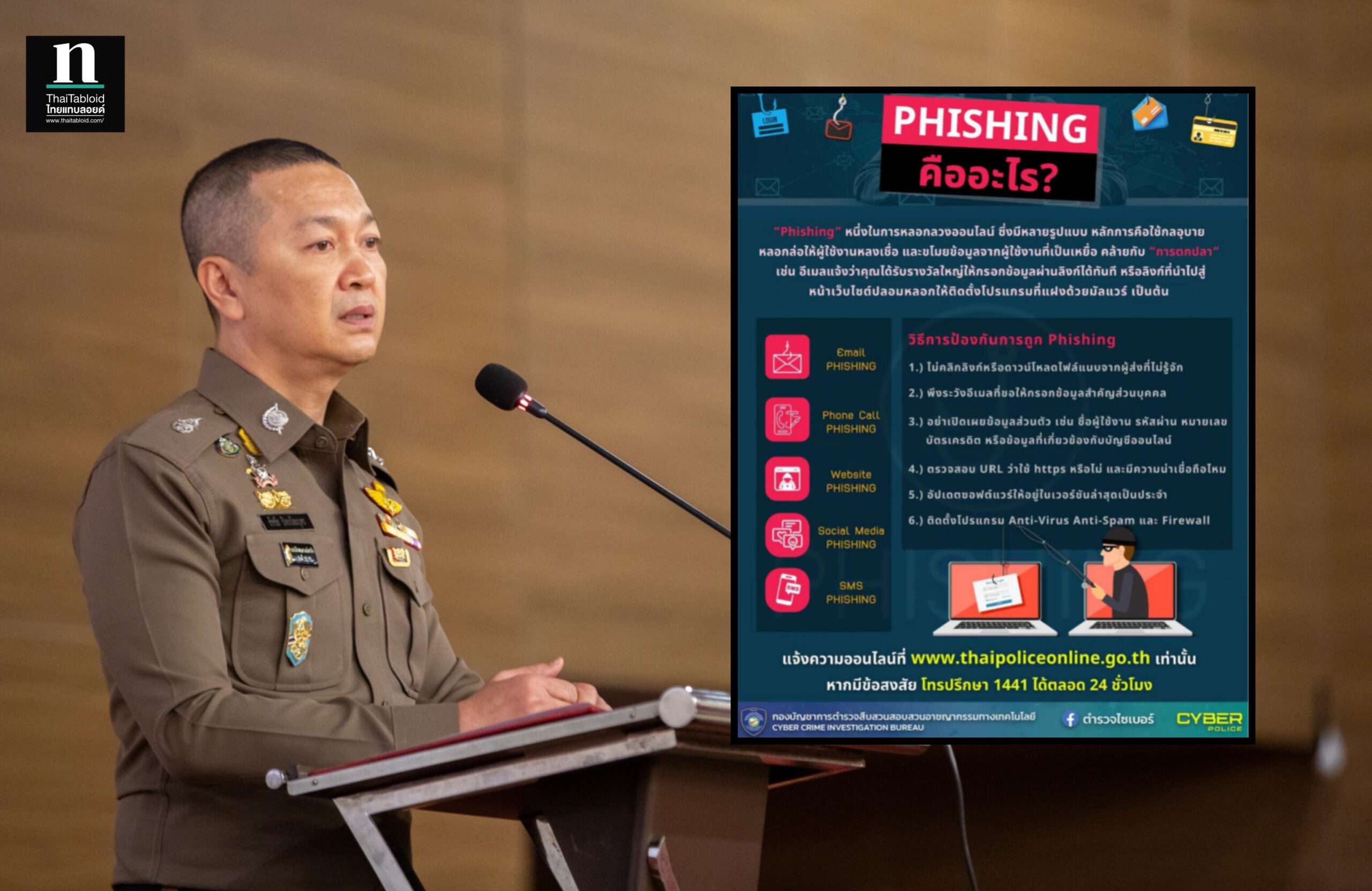 พล.ต.อ.รอย อิงคไพโรจน์ รอง ผบ.ตร./ผอ.ศปอส.ตร. และ พล.ต.ท.ธัชชัย ปิตะนีละบุตร ผู้ช่วย ผบ.ตร./รอง ผอ.ศปอส.ตร. เตือนภัยประชาชนเรื่องความเสียหายจากอาชญากรรมการหลอกลวงบนโลกออนไลน์ล่าสุดคนร้ายได้มีกลโกงใหม่ที่ชื่อว่า “Phising Email” เพื่อหลอกดักเอาข้อมูลสำหรับการ Login เข้าระบบ สร้างความเสียหายให้อย่างมาก