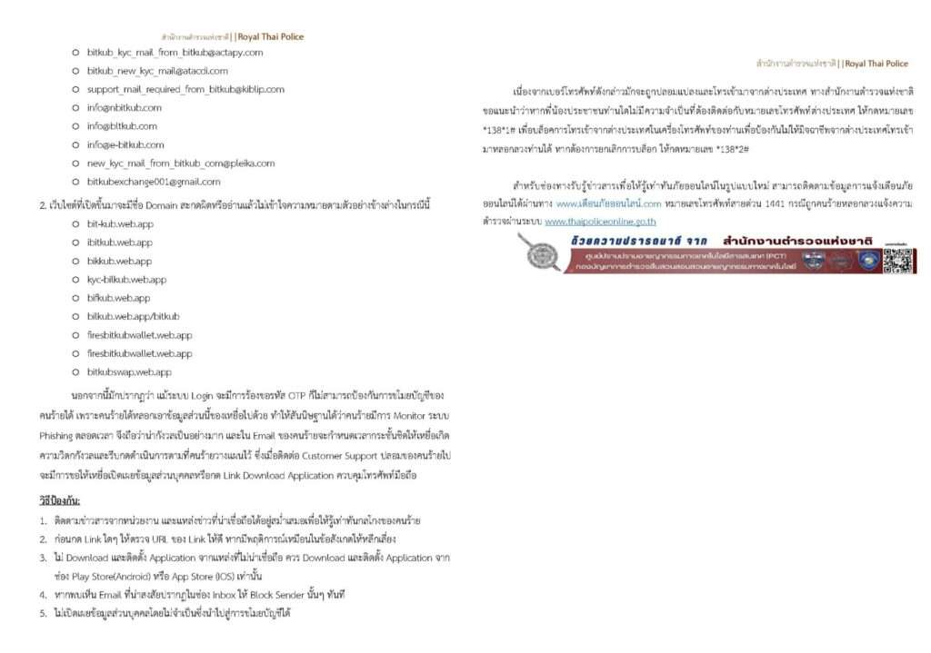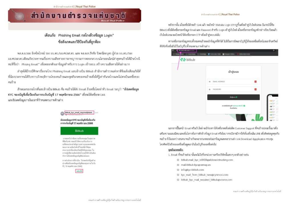 ล่าสุดได้มีกรณีศึกษาเรื่องกลโกง Phishing Email แอบอ้างเป็น Bitkub สำนักงานตำรวจแห่งชาติจึงแจ้งเตือนภัยให้พี่น้องประชาชนได้รับทราบถึงพฤติการณ์ของคนร้ายและจุดสังเกตของคนร้ายเพื่อให้รู้เท่าทันกลโกงและไม่ตกเป็นเหยื่อของคนร้าย