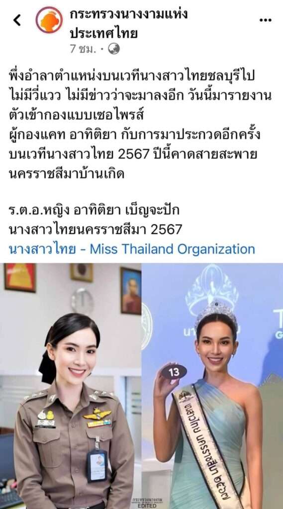 วันที่ 7 ก.พ.67 ที่ ตร. พล.ต.ท.อาชยน ไกรทอง โฆษกสำนักงานตำรวจแห่งชาติ เปิดเผยกรณี ร.ต.อ.อาทิติยา เบ็ญจะปัก หรือผู้กองแคท ตำรวจหญิงสังกัดสำนักงานเลขานุการตำรวจแห่งชาติ ในส่วนงานรับผิดชอบเรื่องงานเอกสาร และงานพิธีการด้านต่างๆ ของสำนักงานตำรวจแห่งชาติ เดินสายประกวดนางงามจนสังคมวิพากษวิจารณ์ว่า กรณีดังกล่าวอยู่ที่ต้นสังกัดที่ต้องควบคุมกำกับดูแลอยู่แล้ว หากมีการไปประกวดก็ต้องดูว่ามีการลาหรือขออนุญาตถูกต้องตามระเบียบหรือไม่ การมอบหมายหน้าที่ต้องไม่ให้เสียหายต่อราชการตำรวจ ซี่งย้ำว่าตรงนี้ต้นสังกัดจะต้องเป็นคนตรวจสอบควบคุมดูแลเรื่องความประพฤติและการมอบหมายหน้าที่ลักษณะงาน ยอมรับว่าในระเบียบไม่มีข้อห้ามชัดเจนว่าไม่ให้ประกวดนางงาม แต่จะเป็นระเบียบลักษณะกว้างๆไม่ให้ประพฤติหรือไปกระทำการใดที่เป็นการเสื่อมเสีย เช่น การประพฤติตนที่ไม่เหมาะสม ทุกอย่างมีกฎระเบียบวินัยกำหนดไว้ ซึ่งไม่ว่าจะเป็นข้าราชการตำรวจหรือข้าราชการสังกัดใดก็จะมีระเบียบอยู่แล้วหากพบว่ามีพฤติกรรมการใดที่เห็นว่าไม่เหมาะสมก็จะมีตั้งแต่การเข้าไปตักเตือนหรือตั้งกรรมการตรวจสอบเรื่องวินัย