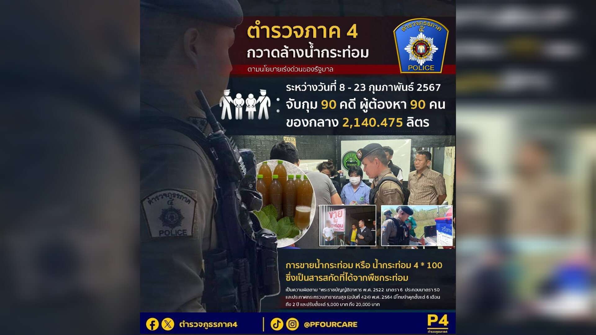 ด้าน พล.ต.ท.สรายุทธ สงวนโภคัย ผบช.ภ.4 ได้สั่งการให้ตำรวจภาค 4 ทั้ง 12 จังหวัด คือ ภ.จว.กาฬสินธุ์, ขอนแก่น, นครพนม, บึงกาฬ, มหาสารคาม, มุกดาหาร, ร้อยเอ็ด, เลย, สกลนคร, หนองคาย, หนองบัวลำภู และ อุดรธานี กวาดล้างจับกุมผู้จำหน่ายน้ำกระท่อม พร้อมประสานฝ่ายปกครองช่วยกวดขันปราบปรามอย่างจริงจัง โดยตั้งแต่วันที่ 8 – 23 ก.พ.67 ตำรวจภาค 4 ได้จับกุมผู้จำหน่ายน้ำกระท่อมไปแล้ว จำนวน 90 ราย ผู้ต้องหา 90 คน ของกลางน้ำกระท่อม 2,140 ลิตร