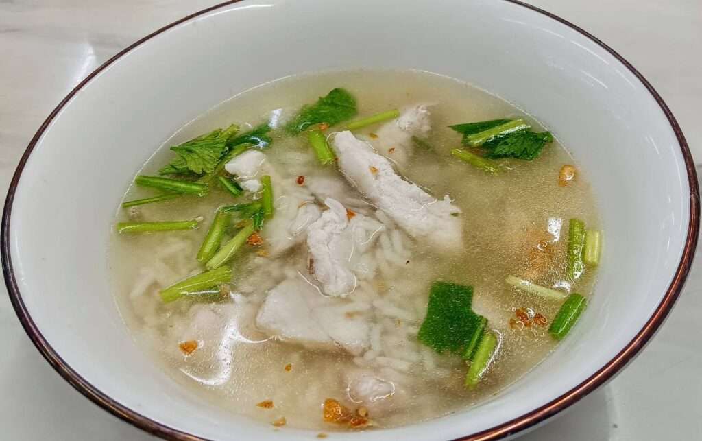 ชามแรกลุงสั่ง“ข้าวต้มปลากระพง” ปลากระพงชิ้นโต เนื้อปลาขาว ลอยเด่น วางมาบนเม็ดข้าวที่หุงบานไม่เละ เนื้อปลาสดไม่มีกลิ่นคาว แล้วราดด้วยน้ำซุปร้อนๆ ที่มีบะเต็งและกุ้งแห้งเป็นตัวชูรสในน้ำซุป โรยหน้าด้วยกระเทียมเจียวและคื่นฉ่าย กินกับเต้าเจี้ยวยำ ที่แยกใส่ถ้วย ใช้เนื้อปลาจิ้ม