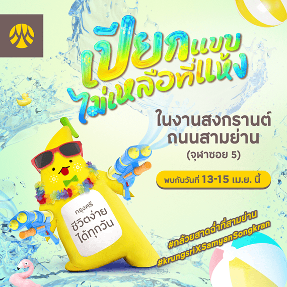 กรุงศรี ร่วมสนับสนุนการจัดงาน Samyan Water Street 2024 (งานสงกรานต์ถนนสามย่าน) โดยภายในงาน ทุกคนจะได้สนุกไปกับ “น้องกล้วยกรุงศรี” ที่เตรียมเอ็นเนอร์จีแบบจัดเต็มไว้โชว์สเต็ปแดนซ์แบบท็อปฟอร์ม พร้อมร่วมเล่นน้ำ สาดฉ่ำ ให้เปียกแบบไม่เหลือที่แห้ง เท่านั้นยังไม่พอ! กรุงศรียังได้เตรียมรถแห่น้องกล้วยที่พร้อมสาดความสุข Water Tower ที่พร้อมเติมน้ำและฉีดความสนุกให้กับทุกคน และผู้ร่วมงานสามารถร่วมกิจกรรมสนุก ๆ ได้ที่บูธกรุงศรี ที่ขนของรางวัลมาไว้แจกผู้ร่วมงานอย่างเต็มที่ หรือจะชวนกันมาถ่ายรูปเช็คอิน มุมชิค ๆ ที่บูธกรุงศรี เก็บโมเมนต์สงกรานต์ที่สุดมันส์กับแก็งค์เพื่อน นอกเหนือจากความสนุก กรุงศรียังเสิร์ฟความง่ายให้ทุกคนสามารถเดินทางเข้าพื้นที่งานได้ง่ายขึ้น ด้วยรถรับ-ส่ง โดยสามารถขึ้นรถได้ที่จุดบริการขนส่งสาธารณะที่ MRT สามย่านมิตรทาวน์ (ทางออก 2) BTS สนามกีฬาแห่งชาติ ศูนย์การค้า I’m Park และ Dragon Town
