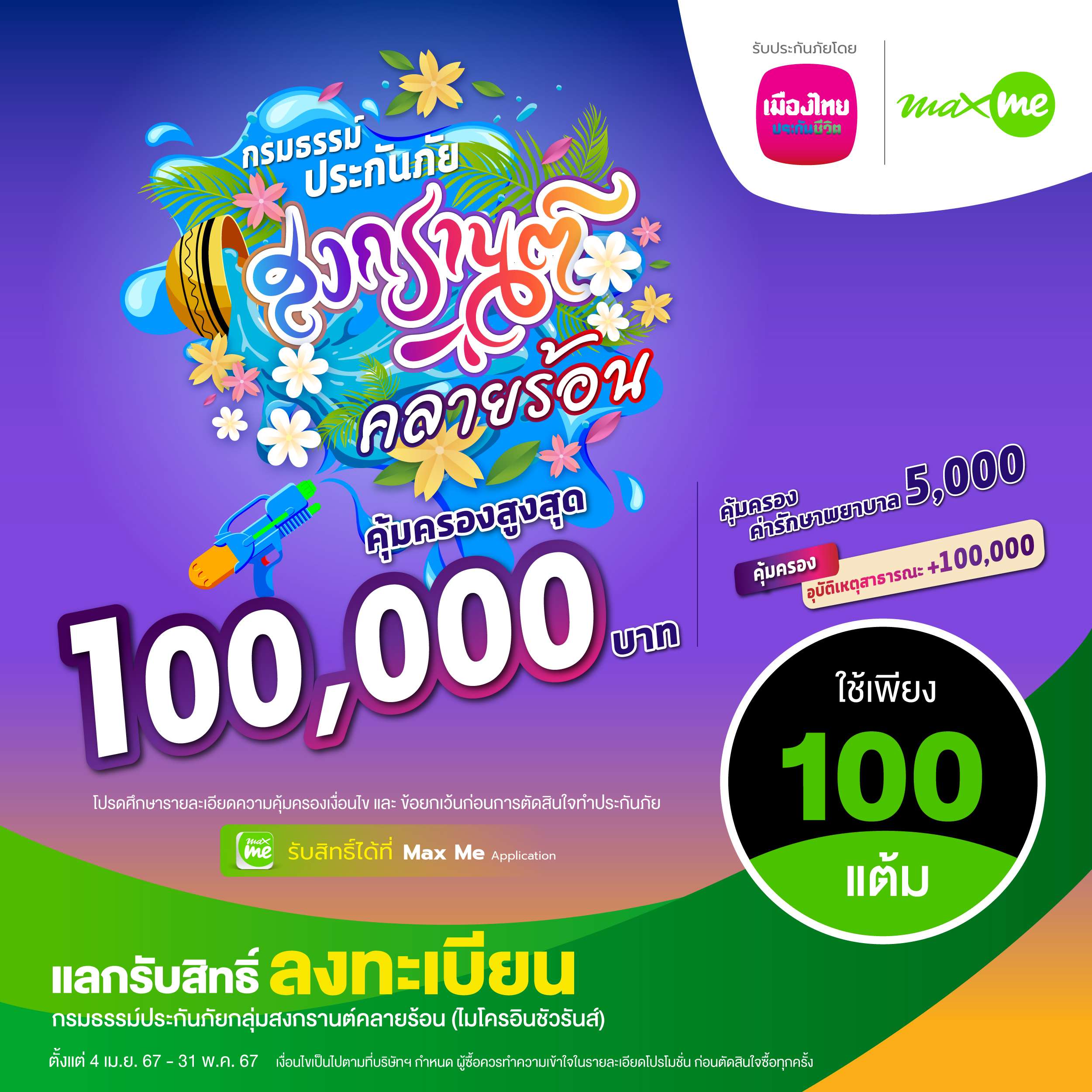 · สมาชิก Max Card ใช้ 100 คะแนน รับสิทธิ์ลงทะเบียนกรมธรรม์ประกันภัยกลุ่มสงกรานต์คลายร้อน (ไมโครอินชัวรันส์)