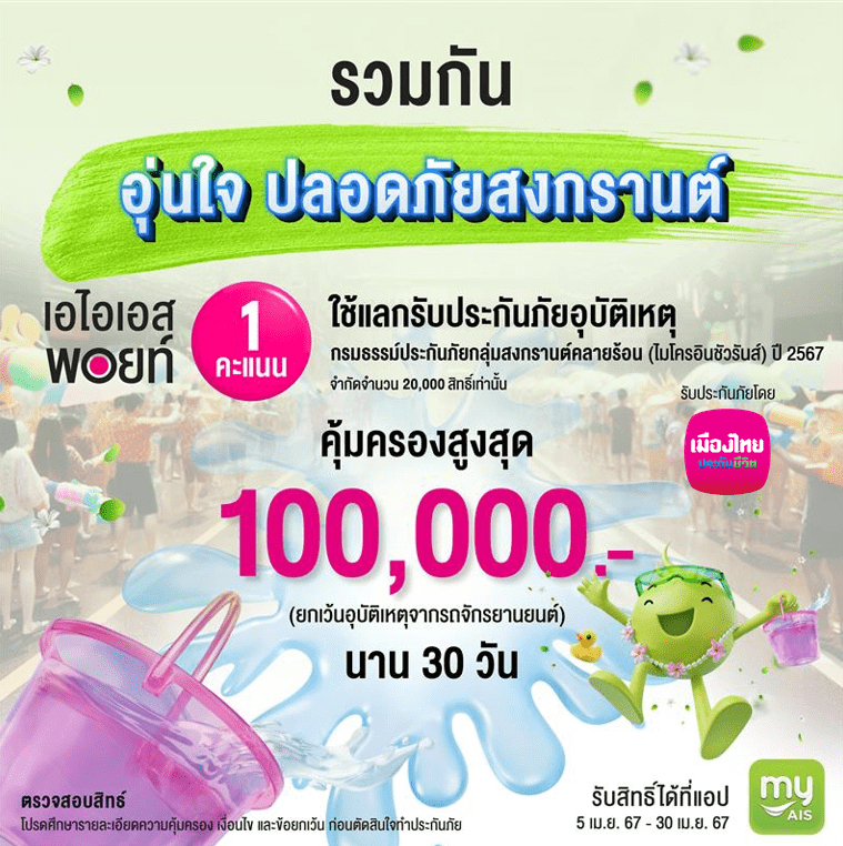 โดยลูกค้าสามารถติดตามรายละเอียดเพิ่มได้ที่แอปพลิเคชัน myAIS และ https://www.ais.th/consumers/promotions/special-promotions/songkran-2024  ซึ่งผู้ที่จะได้รับสิทธิ์จะต้องถือสัญชาติไทยเท่านั้น และมีอายุตั้งแต่  15 ปีบริบูรณ์ ถึง 70 ปีบริบูรณ์ ณ วันที่ทำประกันภัย สำหรับข้อตกลงความคุ้มครองที่ลูกค้าและ ประชาชนทั่วไปจะได้รับ ประกอบด้วย