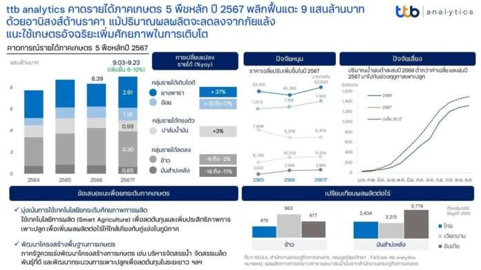 ศูนย์วิเคราะห์เศรษฐกิจ ทีทีบี หรือ ttb analytics คาดปี 2567 รายได้เกษตรพลิกฟื้นแตะ 9 แสนล้านบาท จาก 5 พืชเศรษฐกิจ (ข้าว มันสำปะหลัง อ้อย ปาล์มน้ำมัน และยางพารา) ขยายตัวจากปีก่อน 8-10% อานิสงส์จากราคายางพาราและอ้อยที่ขยายตัวสูง แม้ว่าผลผลิตในภาพรวมจะลดลงจากปัญหาภัยแล้งด้วยปริมาณน้ำฝนที่น้อยในครึ่งแรกของปี ตลอดทั้งโรคระบาดในพืช พร้อมแนะให้ภาคเกษตรไทยเร่งยกระดับศักยภาพการผลิตผ่านการใช้เทคโนโลยีการเกษตรเพื่อเพิ่มความสามารถในการแข่งขันตลาดโลก