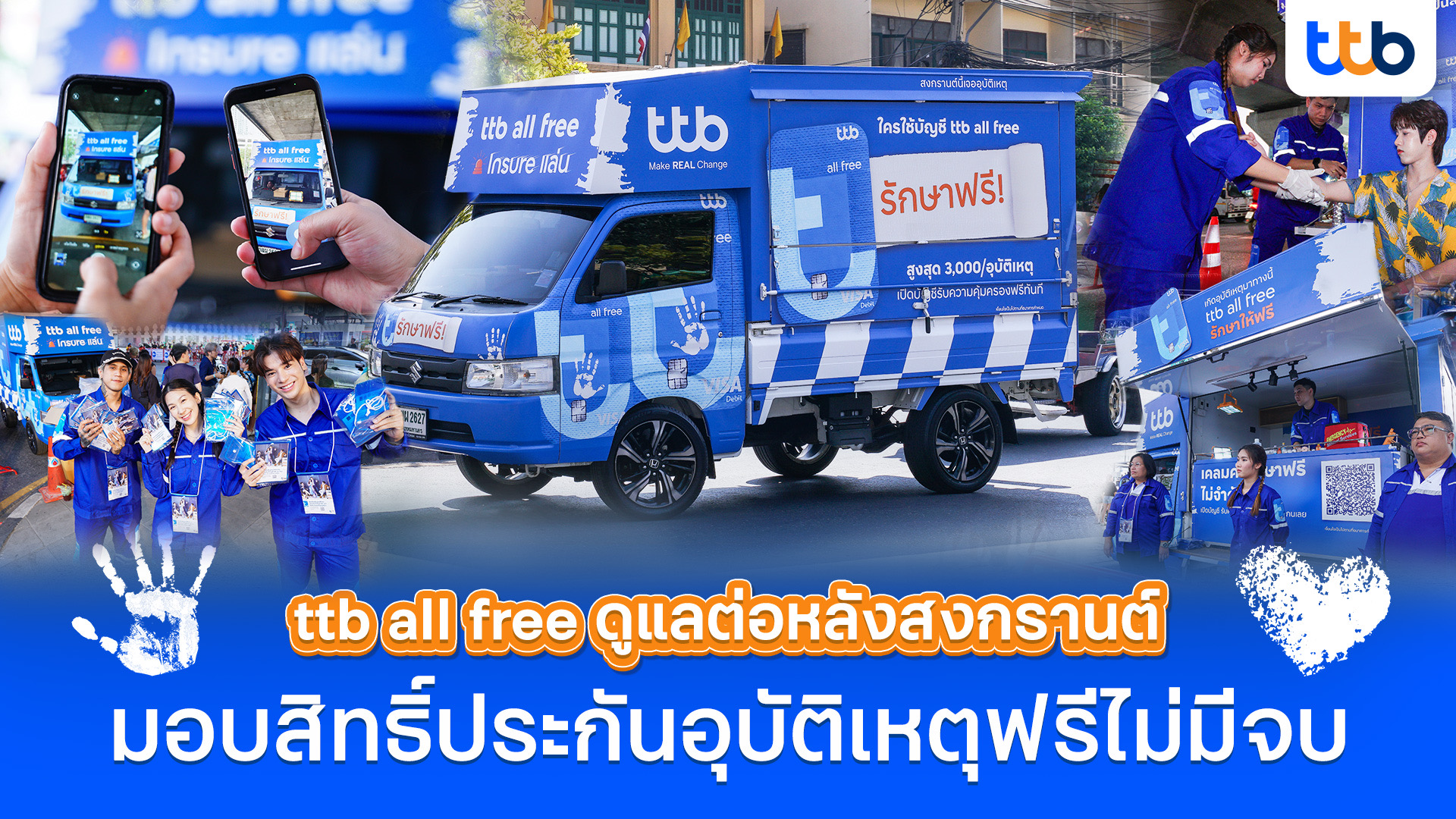 ทีทีบีภาคภูมิใจที่ได้เป็นส่วนหนึ่งที่ช่วยให้คนไทยเข้าถึงสิทธิขั้นพื้นฐานด้านการรักษาและได้รับการดูแลฟรียามบาดเจ็บตลอดช่วงเทศกาลและทุก ๆ ช่วงของชีวิต ซึ่งแม้เทศกาลสงกรานต์จะจบลงแล้ว แต่ ttb all free จะยังคงดูแลต่อไม่สิ้นสุดด้วยความคุ้มครองประกันอุบัติเหตุฟรี และรักษาฟรีทั่วประเทศตลอดทุกวัน เพื่อส่งมอบประสบการณ์ความอุ่นใจที่มีคนคอยใส่ใจดูแล เพียงแค่เปิดบัญชี ttb all free พร้อมฝากเงินคงไว้ในบัญชี 5,000 บาทขึ้นไป รับความคุ้มครองฟรีทันที ทั้งสิทธิ์เบิกค่ารักษาฟรีจากอุบัติเหตุ 3,000 บาท / อุบัติเหตุ ไม่จำกัดจำนวนครั้ง และมีวงเงินคุ้มครองชีวิต 20 เท่าของเงินฝาก สูงสุด 3 ล้านบาท ยิ่งคงเงินฝากไว้เยอะ ยิ่งได้รับความคุ้มครองสูงขึ้น และยิ่งคงเงินฝากไว้ตลอดทั้งเดือนอย่างต่อเนื่องก็จะได้รับความคุ้มครองอย่างต่อเนื่องในทุก ๆ เดือน โดยไม่ต้องเสียค่าเบี้ยประกัน หรือค่าใช้จ่ายใด ๆ เพิ่ม ก็เบิกค่ารักษาได้ฟรี ให้ลูกค้าอุ่นใจในทุก ๆ วัน ไม่ว่าจะเดินทางไปจังหวัดไหน ก็สามารถเข้ารักษาได้ฟรี ไม่ต้องสำรองจ่ายก่อน