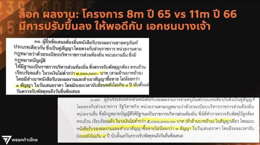 ส.ก.เขตบางซื่อ กล่าวว่า ต่อมาประมูลครั้งที่สอง 23 พ.ค. 2565 ก็ชนะอีก ถ้าดู TOR ก็จะพบว่าเริ่มมีด่านแรกตั้งมาแล้ว โดยกำหนดว่าคุณสมบัติผู้เสนอราคาต้องเคยเป็นคู่ค้ากับท้องถิ่นในวงเงินไม่ต่ำกว่า 3 ล้านบาท และไม่น้อยกว่าหนึ่งสัญญา และต้องย้อนหลังไม่เกินหนึ่งปีเท่านั้น ทั้งที่ปกติกำหนดไว้ 2 ปี ซึ่งบังเอิญเกินไป จากนั้น 28 ก.ย. 2565 ชนะการประมูลครั้งที่ 3 ใช้มุกเดิมเรื่องการกำหนดสเปค เมื่อดูเอกสารจะเห็นว่าแทบจะเป็นการเอาสเปคเครื่องออกกำลังกายของตัวเองให้กรุงเทพฯ เขียน TOR ประมูลครั้งที่ 4 ก็เหมือนเดิม เน้นล็อกสเปคที่ตัวเครื่องออกกำลังกาย มาถึงครั้งที่ห้า ชนะอีกเช่นกัน และประมูลครั้งที่ 6 กำหนดคุณสมบัติ ตัวมูลค่าวงเงินก็เพิ่มขึ้น จำนวนสัญญาก็เพิ่มขึ้น เป็นความบังเอิญที่ TOR เติบโตไปพร้อมกับบริษัทนี้