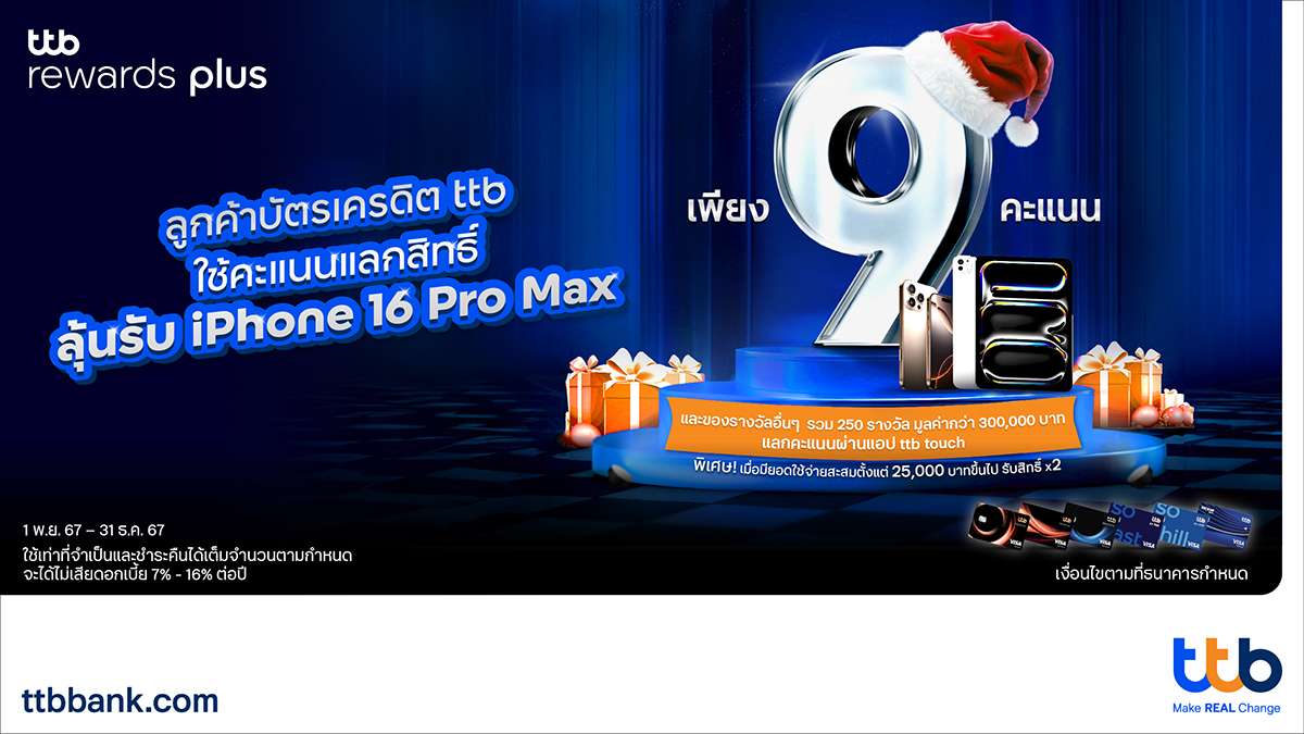 ทีเอ็มบีธนชาต หรือ ทีทีบี มอบความสุขส่งท้ายปีสำหรับลูกค้าบัตรเครดิต ttb  “ยิ่งแลก ยิ่งมีสิทธิ์ลุ้น ใช้คะแนนแลกสิทธิ์ลุ้นรางวัลใหญ่กับบัตรเครดิต ttb” เพียงแลกคะแนน ttb rewards plus 9 คะแนน รับ 1 สิทธิ์ ผ่านแอป ttb touch ลุ้นรับ iPhone 16 Pro Max 512GB และรางวัลอื่น ๆ รวมทั้งสิ้น 250 รางวัล มูลค่ารวมกว่า 300,000 บาท สำหรับลูกค้าบัตรเครดิต ttb ประเภทบัตรหลักที่มีคะแนนสะสม   ประเภทบุคคลธรรมดาเท่านั้น
