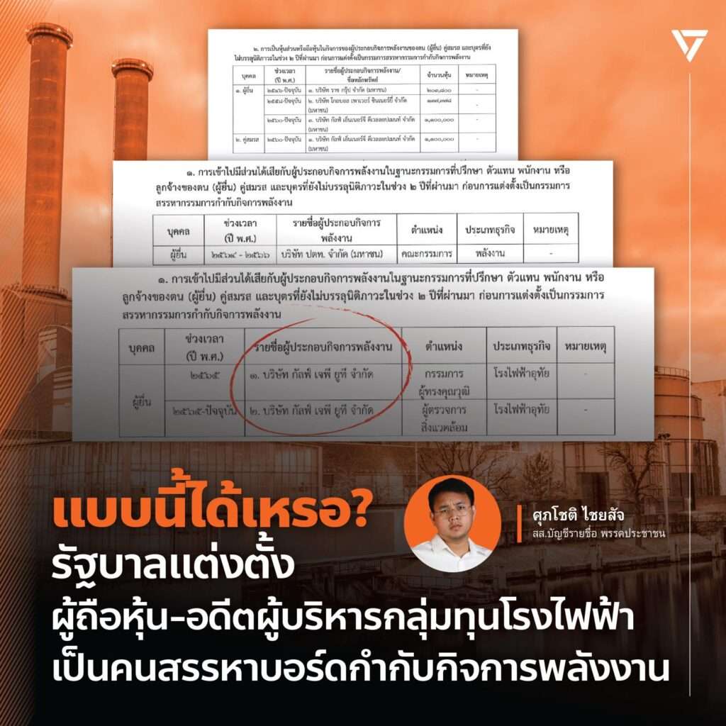 ดังนั้น หากคณะกรรมการสรรหา บอร์ด กกพ. กลายเป็นผู้ถือหุ้นหรือเป็นอดีตผู้บริหารของกลุ่มทุนโรงไฟฟ้าเสียเอง ก็คงจะมองได้ไม่ยากว่านี่คือกระบวนการผลประโยชน์ทับซ้อนที่รัฐบาลกำลังทำให้กระบวนการสรรหาบอร์ด กกพ. กลายเป็นกลไกของกลุ่มทุนพลังงานที่ส่งคนเข้ามาแทรกแซงองค์กรของรัฐและหาช่องท่างต่างตอบแทนเอื้อประโยชน์ให้กับกลุ่มทุนพลังงาน