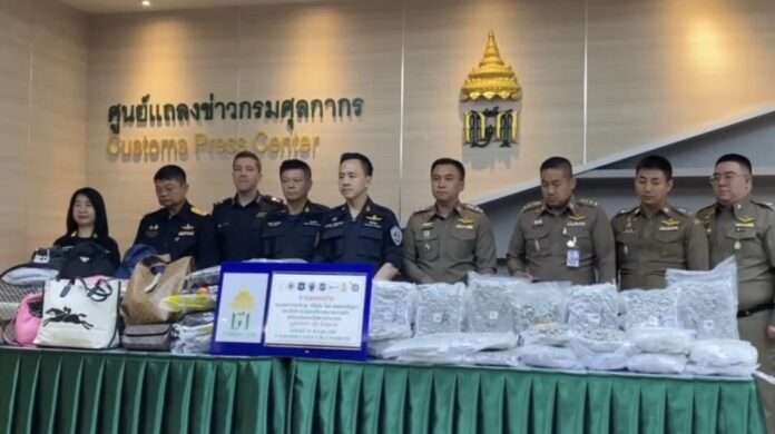 วันนี้ (วันจันทร์ที่ 16 ธันวาคม 2567) เวลา 10.00 น. นายพันธ์ทอง ลอยกุลนันท์ ที่ปรึกษาด้านการพัฒนาและบริหารการจัดเก็บภาษี ในฐานะโฆษกกรมศุลกากร นายจักกฤช อุเทนสุต รองอธิบดีกรมศุลกากรพร้อมผู้แทนจากสำนักงานคณะกรรมการป้องกันและปราบปรามยาเสพติด กองบัญชาการตำรวจปราบปรามยาเสพติด สำนักงานตรวจคนเข้าเมือง กองบัญชาการตำรวจท่องเที่ยว สถานีตำรวจภูธรท่าอากาศยานสุวรรณภูมิ บริษัทท่าอากาศยานไทย จำกัด (มหาชน) และสำนักงานพิทักษ์เขตแดนแห่งออสเตรเลีย (Australian Border Force : ABF)ร่วมกันแถลงข่าว “ศุลกากรบูรณาการกับหน่วยงานที่เกี่ยวข้อง สกัดเฮโรอีน 21.8 กิโลฯ พร้อมตรวจยึดไอซ์ – ช่อดอกกัญชา และสินค้าละเมิดเครื่องหมายการค้าก่อนส่งออกนอกประเทศ” ณ ศูนย์แถลงข่าว อาคาร 1 ชั้น 2 กรมศุลกากร คลองเตย