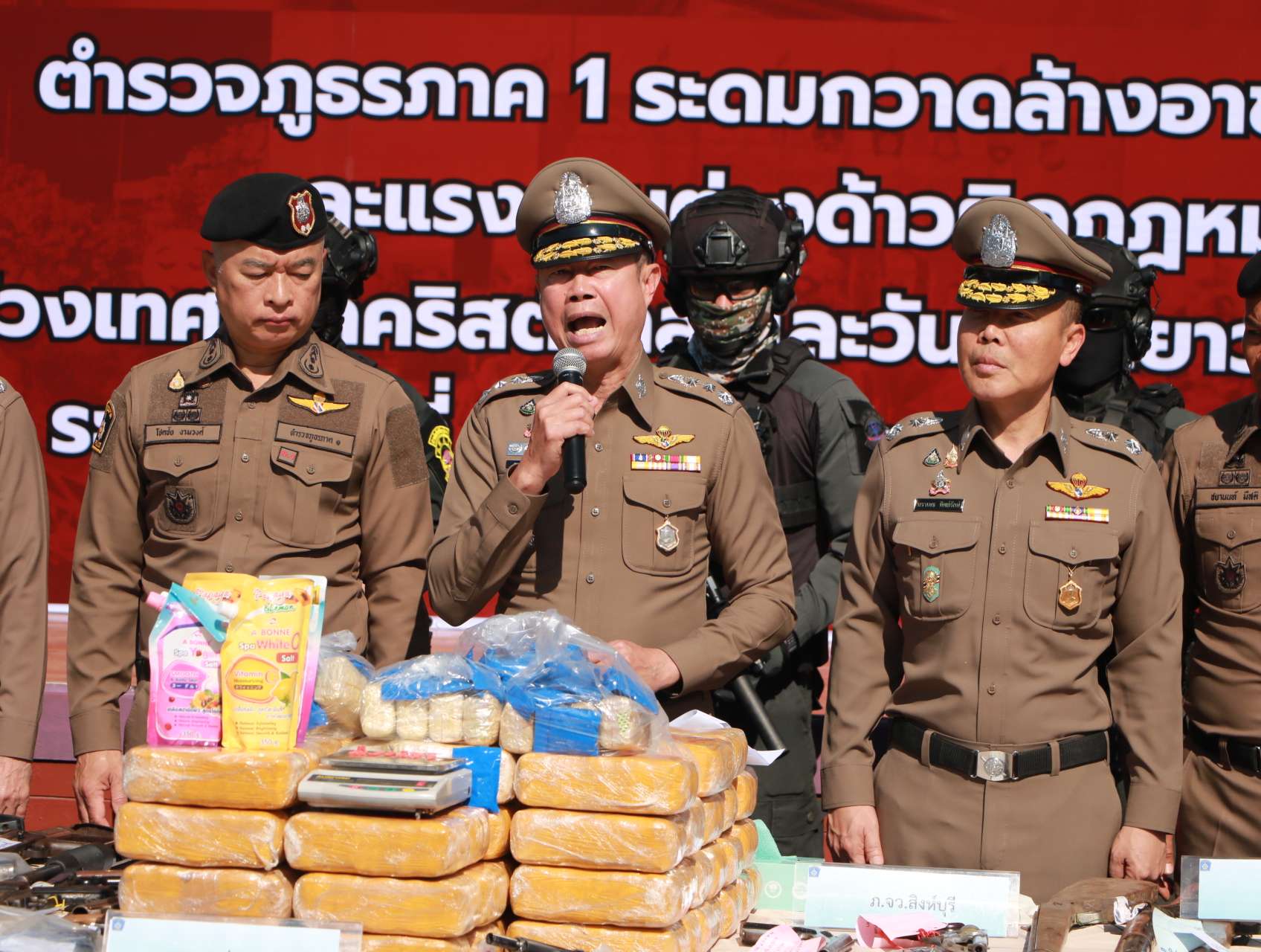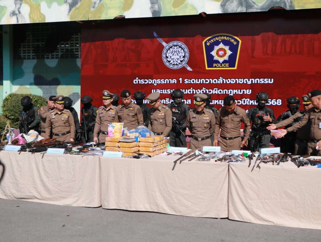 เมื่อเวลา 10.00 น.วันที่ 24 ธ.ค.ที่ลานฝึกยุทธวิธีปราบไพรีอริศัตรูพ่าย ตำรวจภูธรภาค 1 พล.ต.ท.สุรพล เปรมบุตร ผบช.ภ.1 พร้อมด้วย พล.ต.ต.โชคชัย งามวงศ์ รอง ผบช.ภ.1, พล.ต.ต.นราเดช ทิพย์รักษ์ รอง ผบช.ภ.1 และผู้บังคับการตำรวจภูธร ทั้ง 10 จังหวัดในสังกัดตำรวจภูธรภาค 1 ร่วมกันแถลงผลการระดมกวาดล้างอาชญากรรม รักษาความสงบเรียบร้อย การบังคับใช้กฎหมายและอำนวยความสะดวกด้านการจราจรในช่วงวันคริสต์มาสและเทศกาลปีใหม่ 2568 ซึ่งเป็นผลจับกุมระหว่างวันที่ 17-23 ธ.ค.68 รวม 7 วัน โดยมีผลการจับกุม ดังนี้ คดีอาวุธปืนได้ รวม 170 กระบอก แบ่งเป็นปืนไม่มีทะเบียน 97 กระบอก และมีทะเบียน 73 กระบอก, จับกุมคดียาเสพติดได้รวม 1,189 ราย ผู้ต้องหา 1,191 คน ของกลางเป็นยาบ้ารวม 1,032,963 เม็ด ยาไอซ์ 1,594 กรัม ตรวจยึดทรัพย์สิน 22,184,829 บาท, จับกุมแรงงานต่างด้าวผิดกฎหมายได้รวม 1,110 ราย, จับกุมหมายจับค้างเก่าได้รวม 615 คน, จับกุมคดีอาชญากรรมทางเทคโนโลยีได้รวม 354 ราย ผู้ต้องหา 354 คน อายัดทรัพย์สินได้รวม 1,325,800 บาท รวมจับกุมทุกข้อหา 3,876 ราย ผู้ต้องหา 3,968 คน