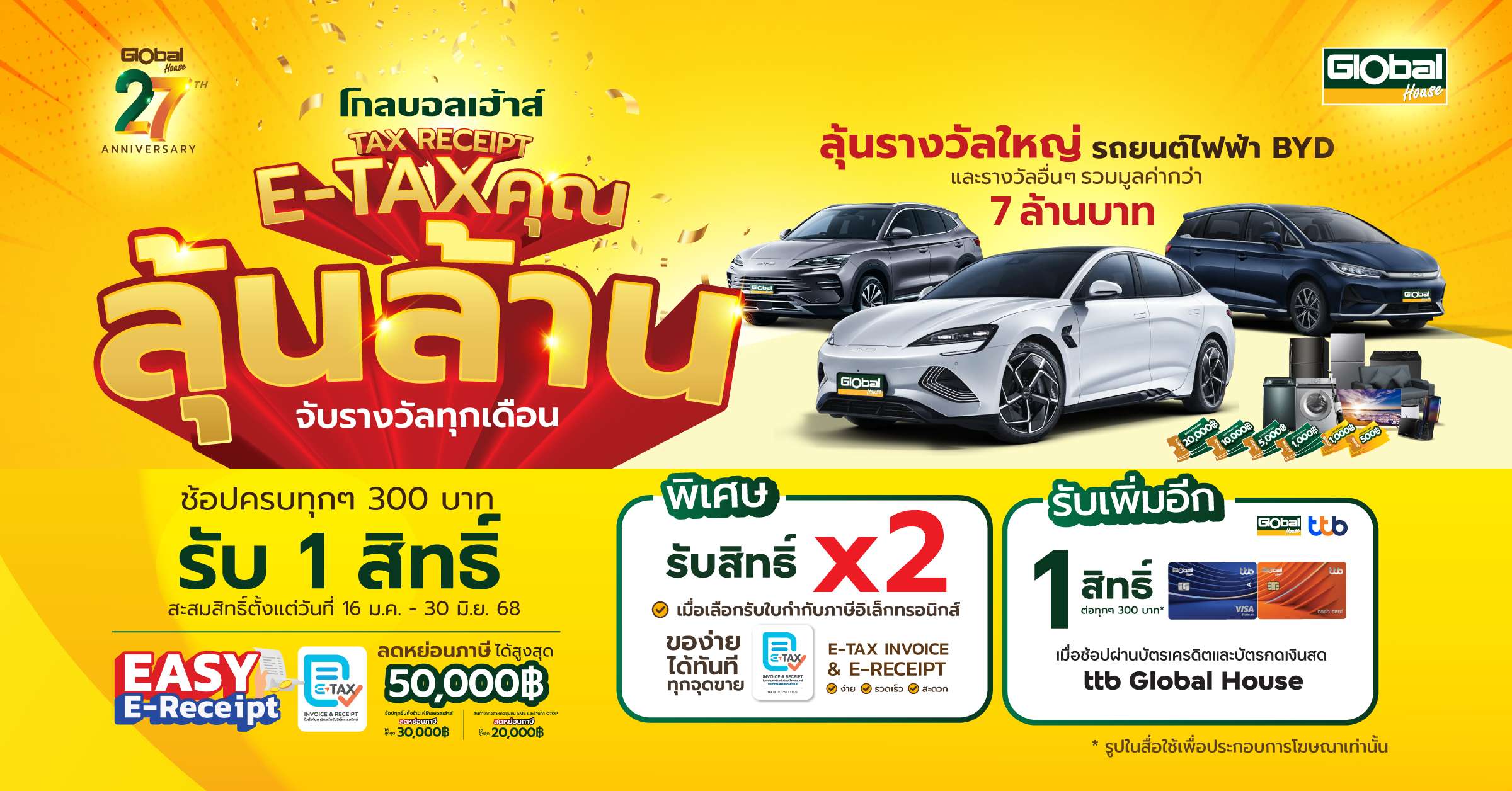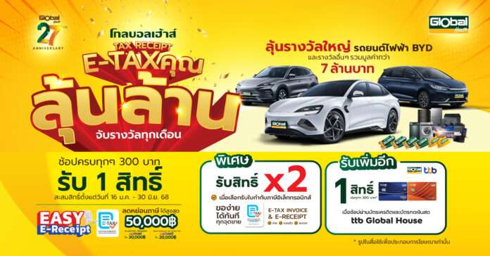#eTaxคุณลุ้นล้าน #โกลบอลเฮ้าส์ลุ้นล้าน #รับโชคที่โกลบอลเฮ้าส์ #โกลบอลเฮ้าส์แจกรถไฟฟ้า #BYD #แจกเครื่องใช้ไฟฟ้า #แจกเฟอร์นิเจอร์ #แจกคูปองส่วนลด #รางวัลรวมมูลค่ากว่า7ล้านบาท #ช้อปออนไลน์ #โชคหล่นทับ
