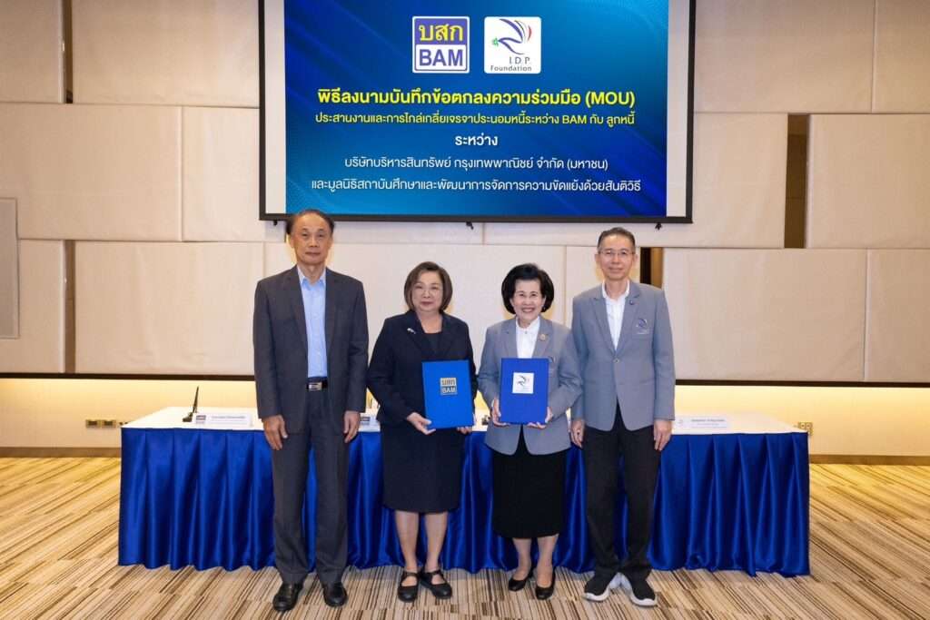วันที่ 20 มกราคม 2568 ที่บริษัทบริหารสินทรัพย์ กรุงเทพพาณิชย์ จำกัด (มหาชน) สำนักงานใหญ่ ได้มีพิธีลงนามความร่วมมือ ระหว่าง มูลนิธิสถาบันศึกษาและพัฒนาการจัดการความขัดแย้งด้วยสันติวิธี (ส.พ.ส) โดย นางประกายรัตน์ ต้นธีรวงศ์ ประธานมูลนิธิ กับ BAM โดย นางทองอุไร ลิ้มปิติ ประธานกรรมการ บริษัทบริหารสินทรัพย์ กรุงเทพพาณิชย์ จำกัด (มหาชน) และ บริษัท บริหารสินทรัพย์ อารีย์ จำกัด หรือ บบส.อารีย์ โดย นายสันธิษณ์ วัฒนกุล ประธานเจ้าหน้าที่บริหาร ได้ลงนามบันทึกข้อตกลงความร่วมกัน
