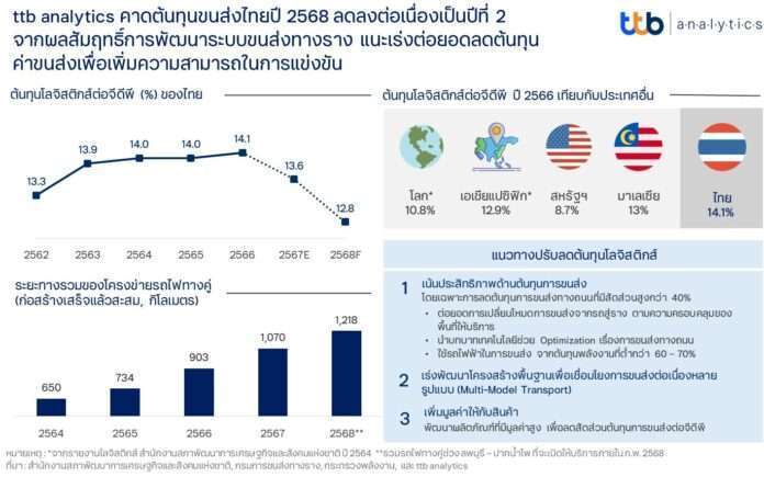ศูนย์วิเคราะห์เศรษฐกิจ ทีทีบี หรือ ttb analytics ประเมินสัดส่วนต้นทุนโลจิสติกส์ต่อจีดีพีปี 2567 เหลือ 13.6% จากระยะทางของรถไฟทางคู่ที่เพิ่มขึ้น 18.5% ส่งผลให้ทิศทางการเปลี่ยนโหมดขนส่งจากรถสู่รางซึ่งมีต้นทุนต่ำกว่าเกือบ 3 เท่า มีความชัดเจนขึ้น ทั้งนี้ คาดปี 2568 ต้นทุนโลจิสติกส์ต่อจีดีพีของไทยมีแนวโน้มปรับลดลงต่อเนื่องเป็นปีที่ 2 ติดต่อกันแตะระดับ 12.8% ตามแผนพัฒนารถไฟทางคู่และรถไฟสายใหม่ แนะเร่งเพิ่มประสิทธิภาพด้านการขนส่ง พัฒนาโครงสร้างพื้นฐานเพื่อรองรับการขนส่งต่อเนื่องหลายรูปแบบ และเพิ่มมูลค่าให้กับสินค้า เพื่อลดต้นทุนโลจิสติกส์ต่อจีดีพีในอัตราเร่ง